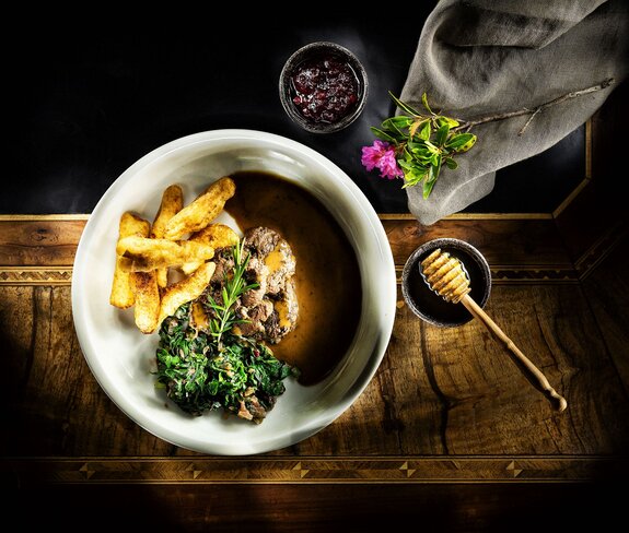 Schnitzel schneiden und mit Salz und Pfeffer würzen. Öl in einer Pfanne erhitzen. Fleisch darin kräftig anbraten, herausnehmen und zur Seite stellen. Thymianblättchen und Wacholderbeeren zum Bratensatz geben, mit Wildfond ablöschen, Honig einrühren und kurz aufkochen lassen. Bei schwacher Hitze ca. 4 Minuten köcheln lassen, dann abseihen. Stärke mit 4 EL Wasser glatt rühren und langsam in die Sauce einlaufen lassen, aufkochen und kurz köcheln lassen. Nochmals abschmecken und die Sahne dazugeben.