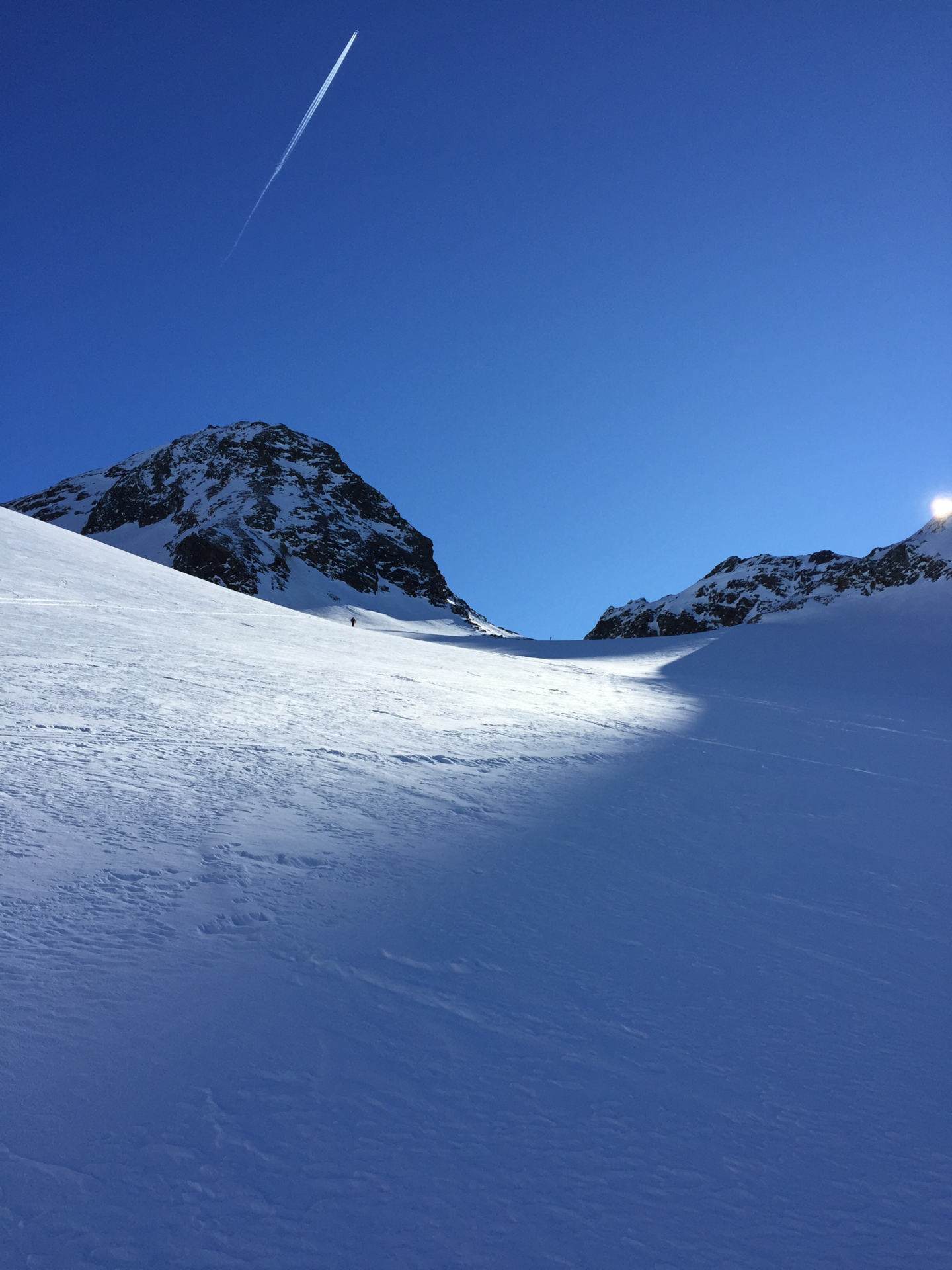 Abfahrt: wie Anstieg - allerdings ist zu beachten, dass der Gletscher durchaus Spalten haben kann. Eine gute Wahl der Abfahrtsspur ist wichtig. Man hält sich in der Abfahrt eher rechts am Hang, um diesen gut ausnützen zu können.