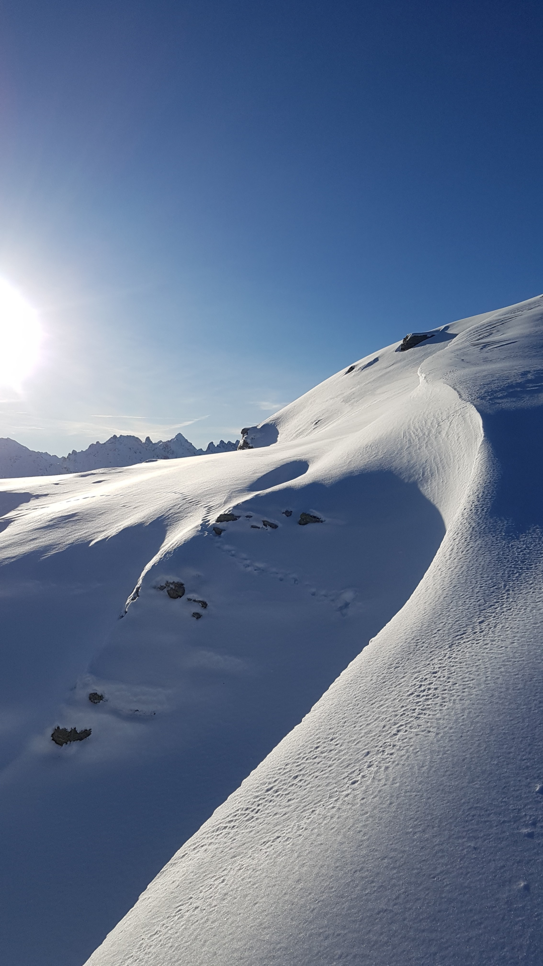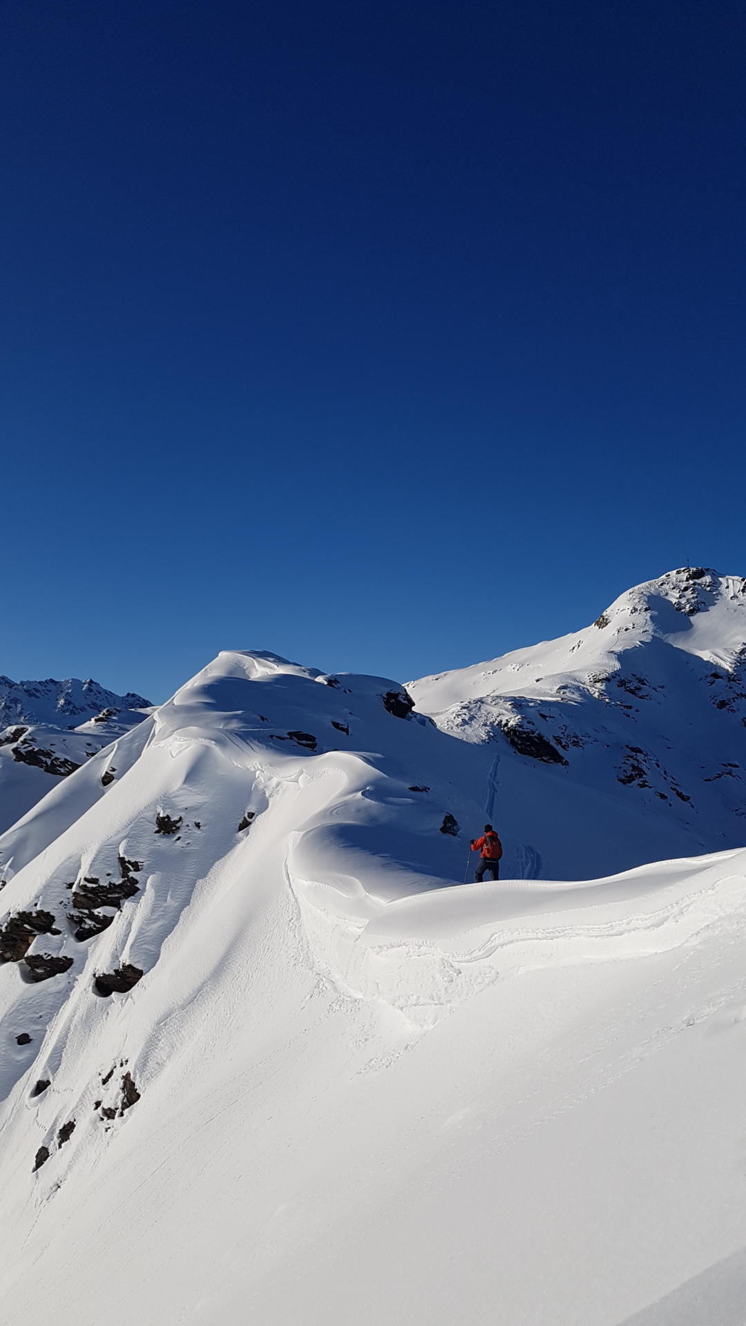 Sehr schöne Skitour mit nur wenigen Höhenmeter im Anstieg und daher steht die Abfahrt bei dieser Tour ganz klar im Vordergrund. Aufgrund der ersten Anstiege mit der Versettla Bahn bis zur Bergstation und dann mit dem Schlepplift Burg wird sie als einfach bezeichnet. Eine gültiges Liftticket ist jedoch erforderlich. Nachdem man die Versettla hinter sich hat, bewegt man sich im Kammbereich, welcher je nach Schnee- und Wetterlage eine besondere Herauforderung darstellt.
