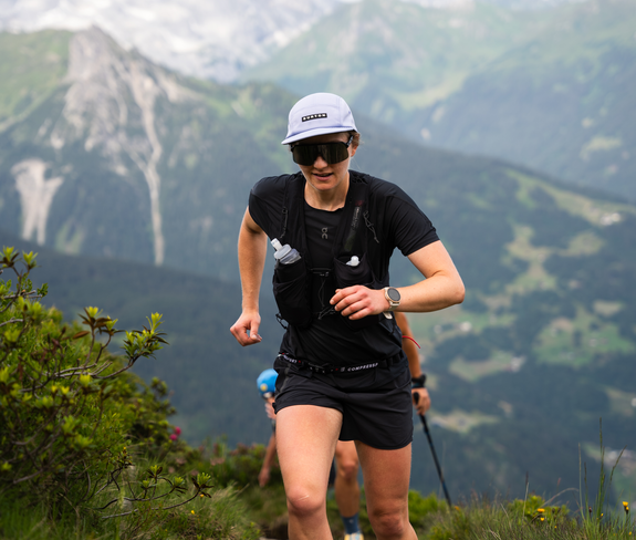 Klassische Trailrunning-Ausrüstung (Trailrunning-Schuhe und Kleidung, Weste mit Verpflegung,...).