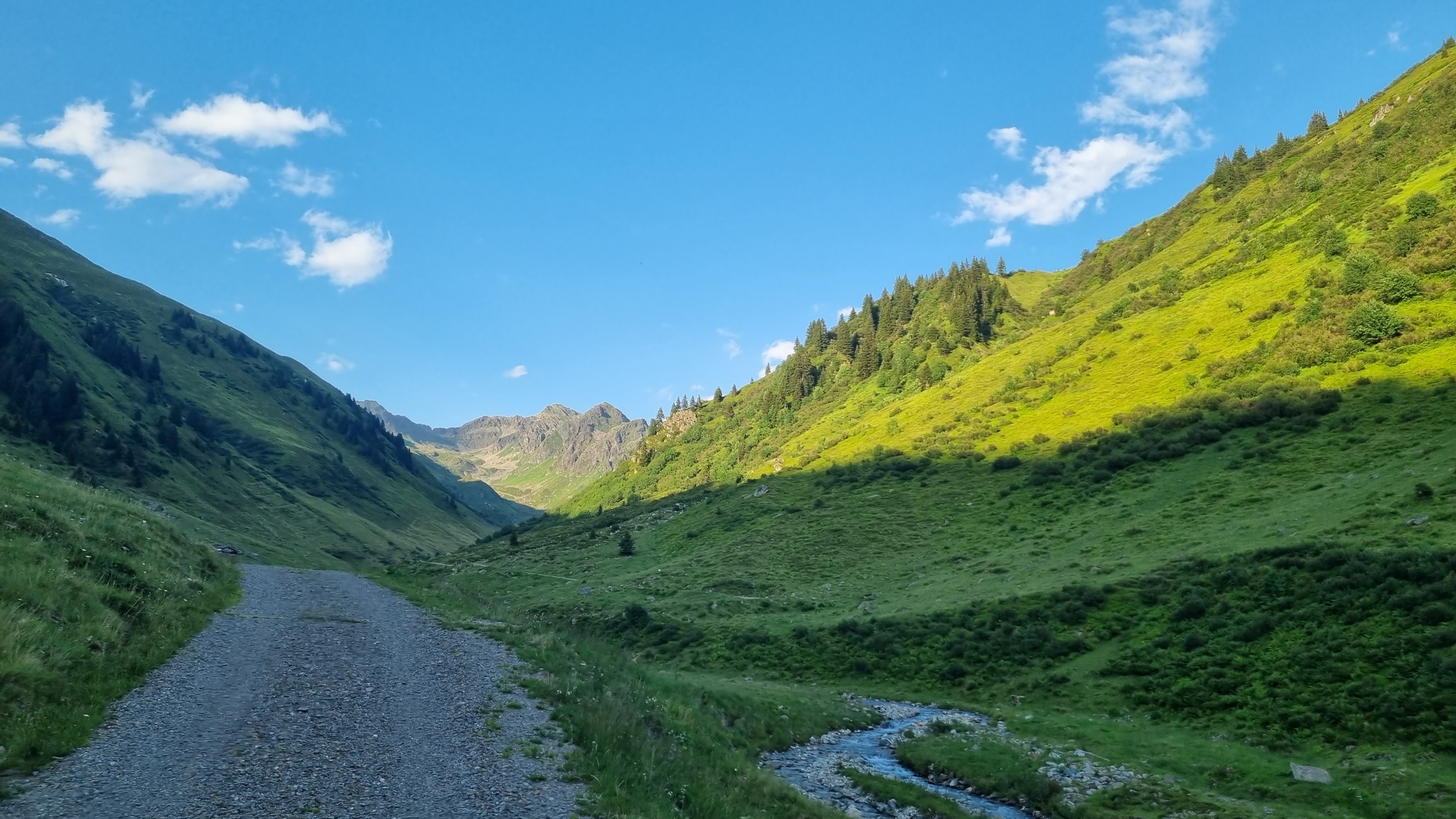Vom Startpunkt der Tour in St. Gallenkirch fährst Du auf dem Radweg bis zum Mountain Beach in Gaschurn. Hier zweigt die Tour links ab ins unberührte Valschavieltal - mit seinen Wasserfällen und alten Maisäßsiedlungen eines der ursprünglichsten Seitentäler des Montafon. Auf dem breiten Schotterweg wird die Tour bis zum Maisäß Valschaviel zu einer ziemlich knackigen Angelegenheit mit konstanter Steigung. Vorbei am malerisch angelegten Fischteich, begleitet von Gebirgsbächen fährst Du nun auch etwas flacherem Gelände ins hintere Tal bis zur Mardusa Alpe. Der letzte Anstieg bis kurz vor die Hirtenhütte auf dem inneren Rossberg (2.160 m) fordert nochmals volle Konzentration, von hier läufst Du noch ca. 300 Meter bis zur Hütte. Oben angekommen erwartet Dich ein großartiges Panorama auf die umliegende Berglandschaft.
