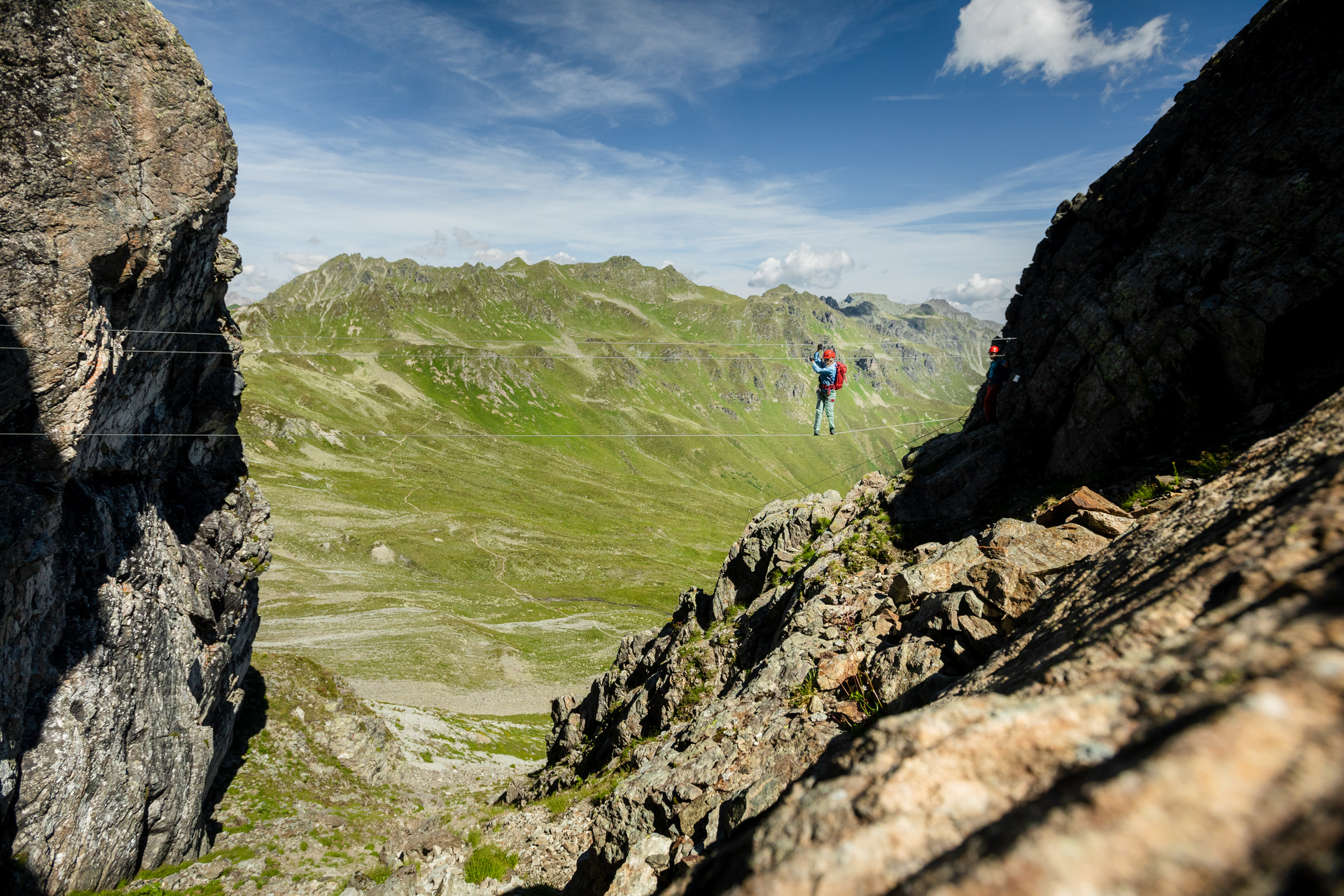 Ein toller hochalpiner Klettersteig, der dank seiner Lage mitten im Wandergebiet Gargellen leicht erreichbar ist. Neben der luftigen Grat- und Wandkletterei im dunklen Gneis des Silvrettakristallin erwarten Dich zwei Seilbrücken, die Adrenalin pur garantieren. Um auf den Gipfel zu gelangen, stehen zwei Varianten zur Auswahl – die leichtere folgt im Schwierigkeitsgrad B/C dem Grat entlang, die schwierigere (C/D) führt zusätzlich über die zwei Seilbrücken. Je näher Du dem Gipfelkreuz kommst, umso weiter reicht der Panoramablick über die Berge des Rätikon und der Silvretta.