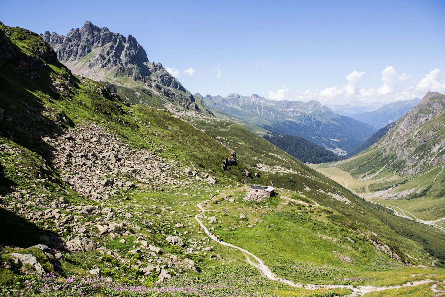 Die Weitwanderung startet beim Montafoner Heimatmuseum im Zentrum von Schruns. Der Weg führt über den Veltlinerweg Richtung Fußballstadion, dann weiter über das Schrunser Feld und über den Illweg taleinwärts Richtung Silvretta. Du wanderst am Ortsteil Mauren vorbei und in Galgenul angekommen biegst Du nach rechts ins Gargellental ab. du wanderst an der Rütikapelle auf Rüti und an der kleinen Fideliskapelle vorbei und erreichst dann Gargellen, das höchstgelegene Dorf im Montafon. Etwas oberhalb von Gargellen liegt der Ortsteil Vergalden. Dort angekommen zweigst Du ins Valzifenztal ab und wanderst an der Madrisa Hütte, Unteren- und Oberen Valzifenzalpe sowie Zollhütte (befindet sich etwas unterhalb des Schlappiner Jochs) vorbei. Auf dem Schlappiner Joch befindet sich die Landesgrenze Österreich und Schweiz.