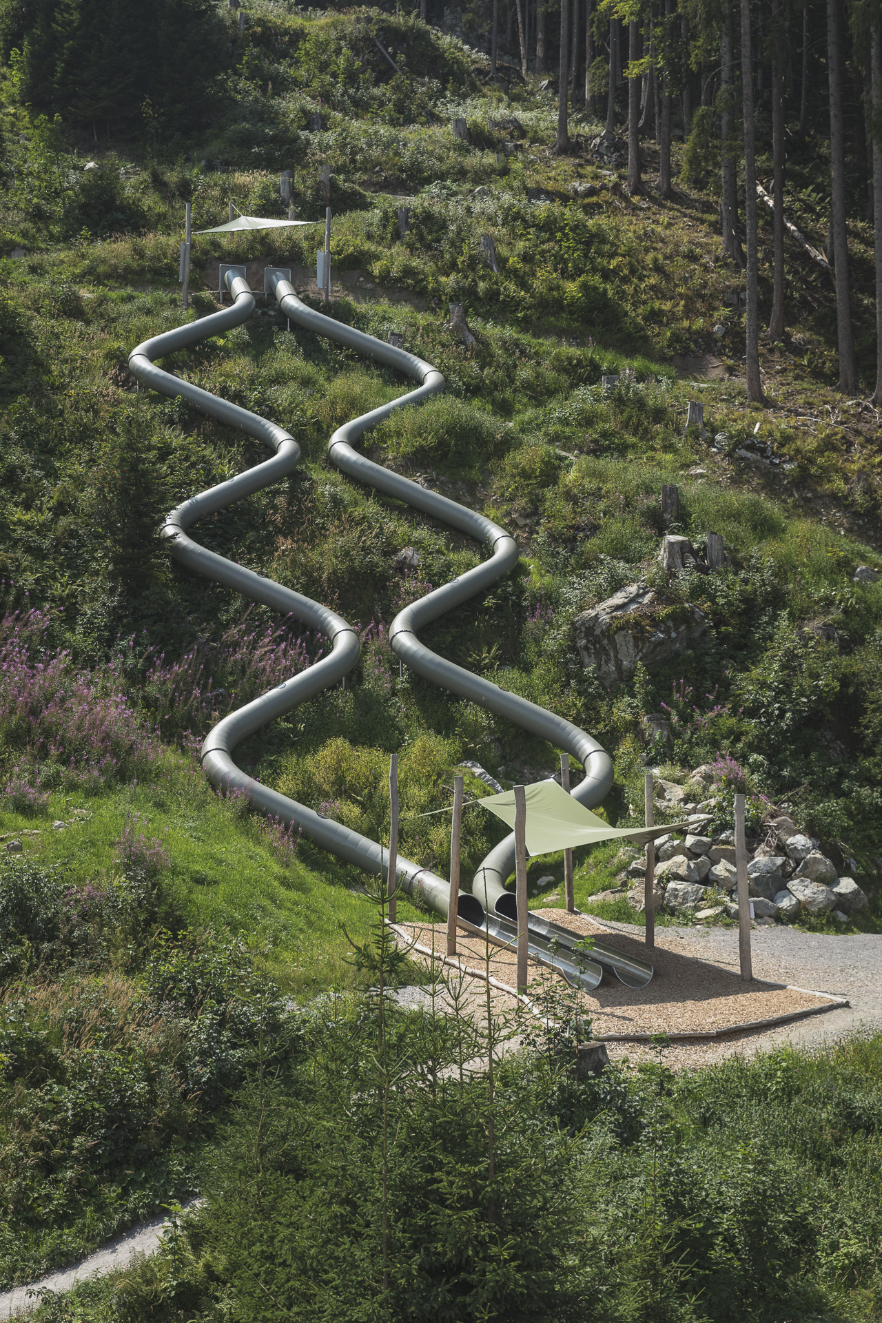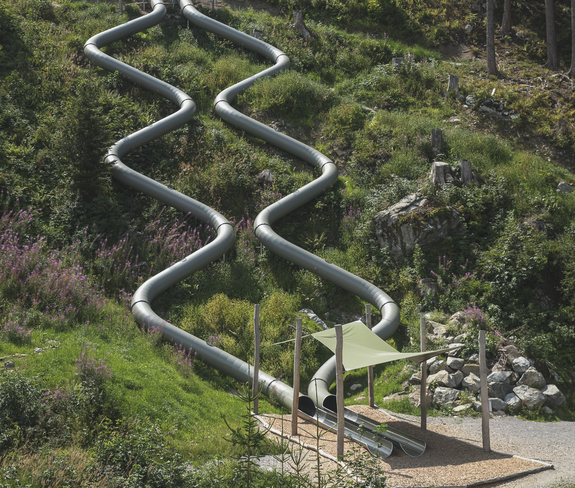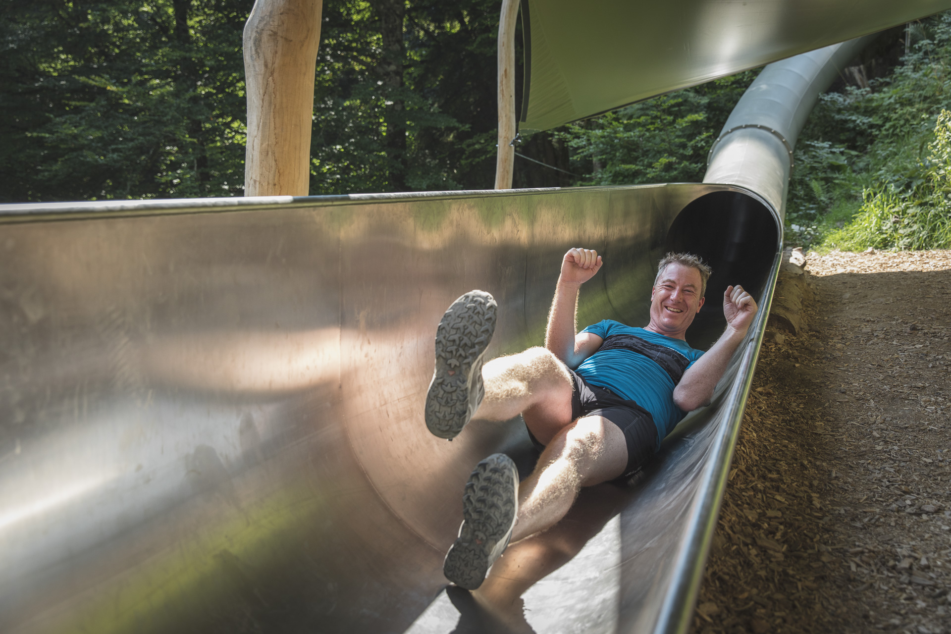 Zwischen den Rutschen gibt es auch Pausenplätze, wo Du Deine Jause essen oder kurz verschnaufen kannst, bevor es weiter zur nächsten Rutsche geht.
