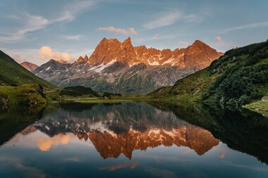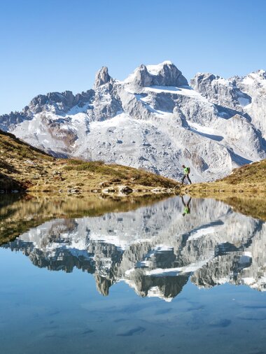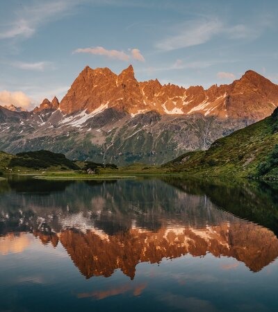 Weiße Steinriesen vor blühenden Wiesen und grasendem Montafoner Braunvieh, frische Bergquellen, dazu das türkisblaue Wasser des Lünersees. Eintauchen und auftanken, dafür ist dieser Lebensraum wie geschaffen. Mit etwas Glück schauen Gämsen von den Gipfeln und es pfeifen die Murmeltiere.