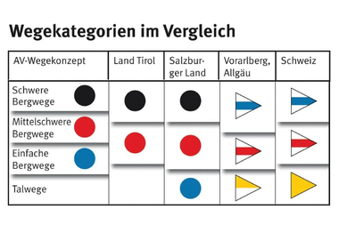Besonders im Gebiet der Silvretta gibt es zahlreiche grenzüberschreitende Touren ins benachbarte Tirol. Daher ist es wichtig, auch über das Markierungskonzept im Nachbarland Bescheid zu wissen. Denn im Gegensatz zum Wanderwegekonzept in Vorarlberg, das jenem der Schweiz sehr ähnlich ist, richtet sich das Tiroler Wander- und Bergwegekonzept nach der Klassifizierung des Bundeslandes Tirol und unterscheidet sich doch maßgeblich.