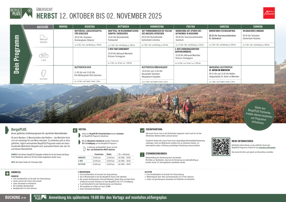 Dann nutze Deinen Vorteil der rabattierten Teilnahme. Denn mit der Montafoner Gästekarte erhältst Du 20 Prozent Ermäßigung auf das BergePLUS Programm!