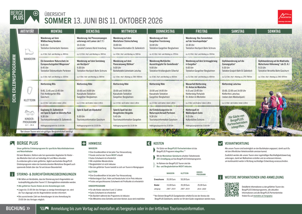 Dann nutze Deinen Vorteil der rabattierten Teilnahme. Denn mit der Montafoner Gästekarte erhältst Du 20 Prozent Ermäßigung auf das BergePLUS Erlebnisprogramm!