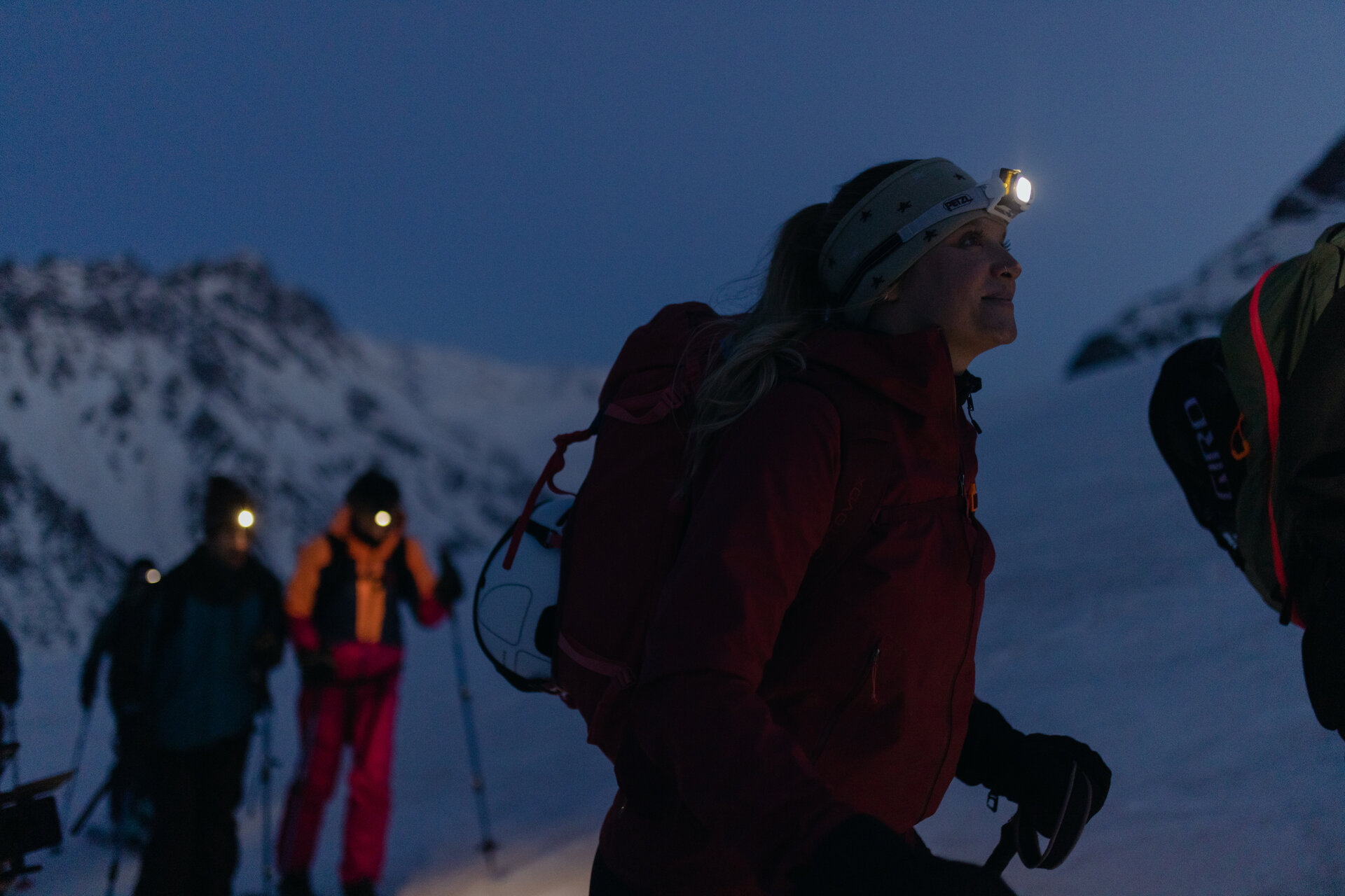 Oben angekommen, genießt Du eine gemütliche Jause am Fuße der mächtigen Madrisa, während der Himmel in warmen Farben leuchtet. Anschließend fährst Du im Lichtkegel Deiner Stirnlampe auf Skiern ins Tal ab. Diese Tour ist speziell für Skitouren-Einsteiger geeignet.
