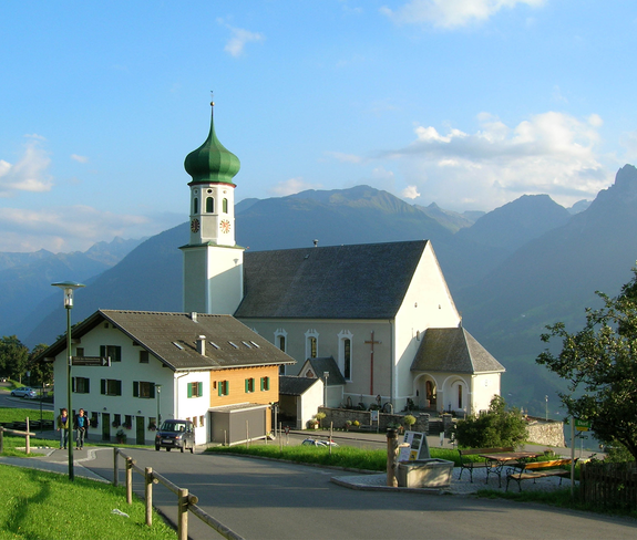 From the church square, the route gently rises but remains accessible, following the panoramic road towards Hotel Fernblick. The road is quite quiet and not heavily trafficked. Impressive views repeatedly open up over the Montafon valley, the opposite Rätikon mountain range, and the Verwall.