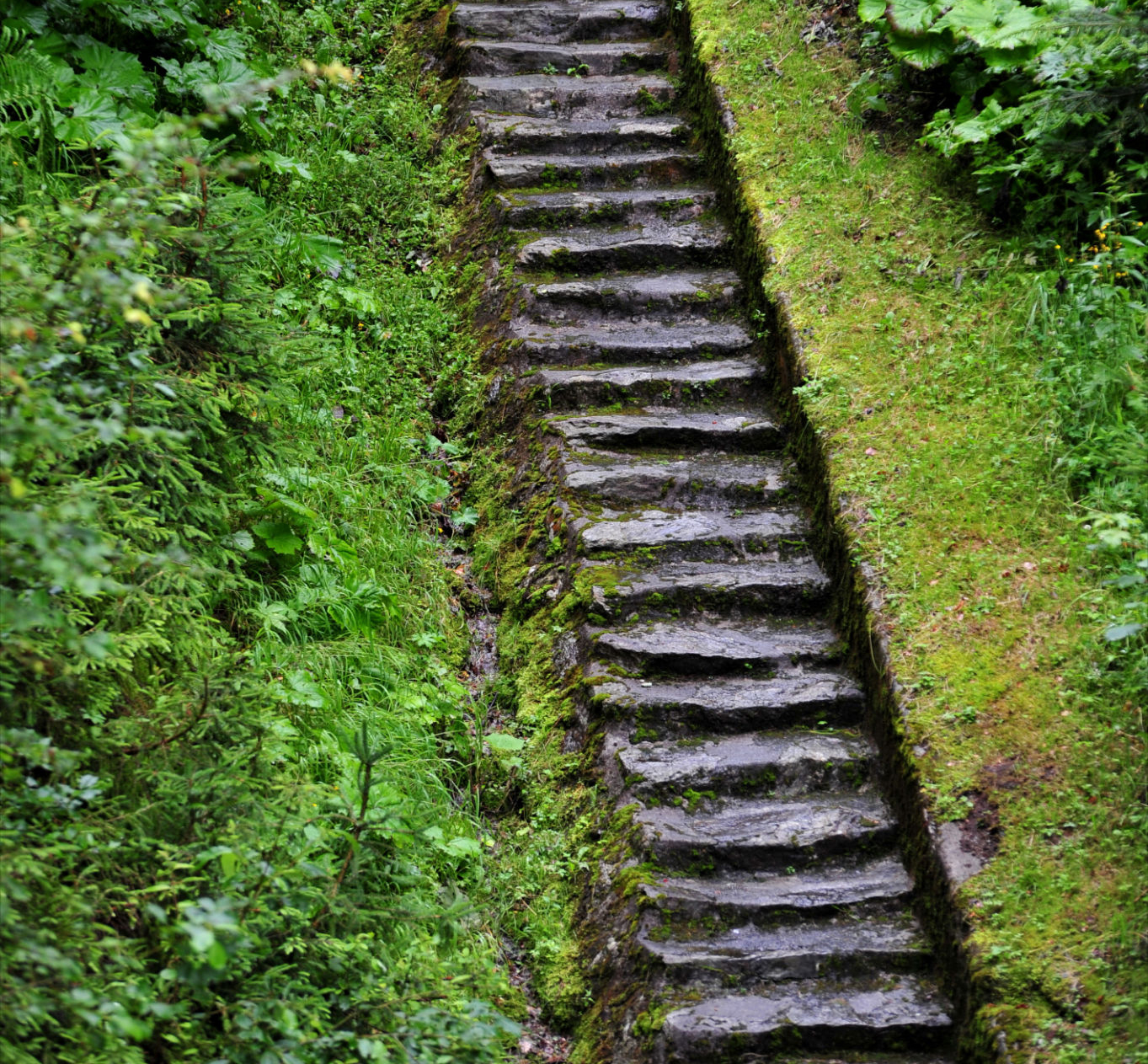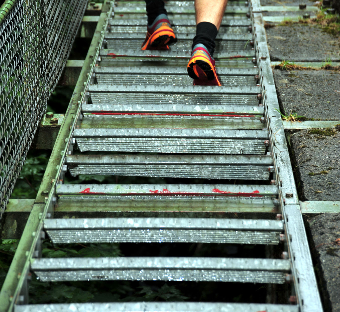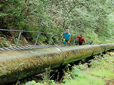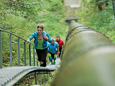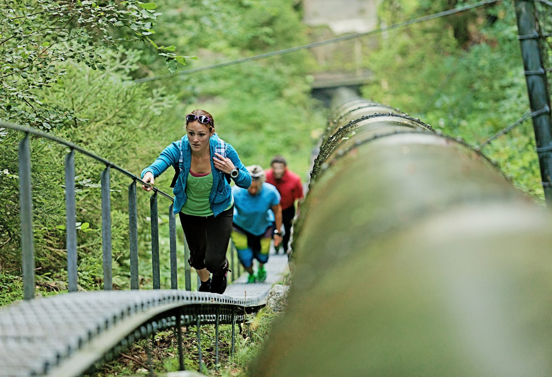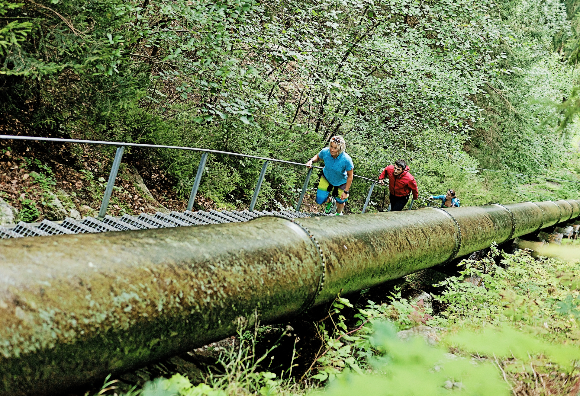 The starting point is at Aktivpark Montafon in Schruns-Tschagguns. Via the street "Waldweg" and Birkenweg you reach the E-Werk Gampadels in the Zelfen area. Right next to it is the Nordic Montafon sports center with the modern ski jump facility. Behind the E-Werk Gampadels is the entrance. The route leads up about 914 steps along the Aquastiege next to a pressure pipeline up to a turnstile, just below Wirtschaft Bitschweil (place to stop for refreshments).