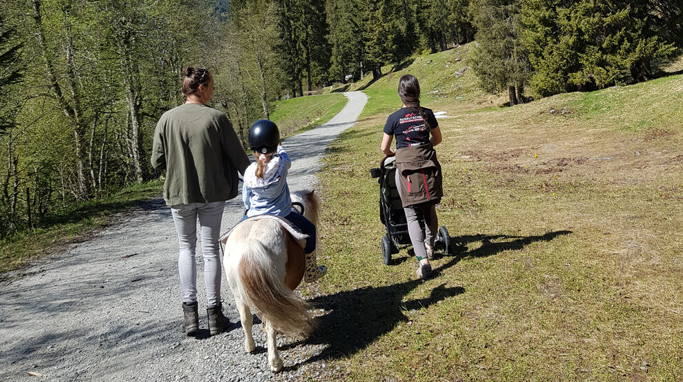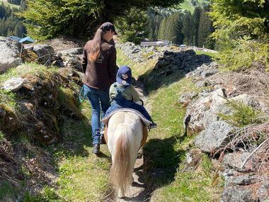 für die größeren Kinder bieten wir Spaziergänge im Gelände oder die ersten Reitstunden auf unserem Reitplatz mit unserer Ponystute Amrei an.