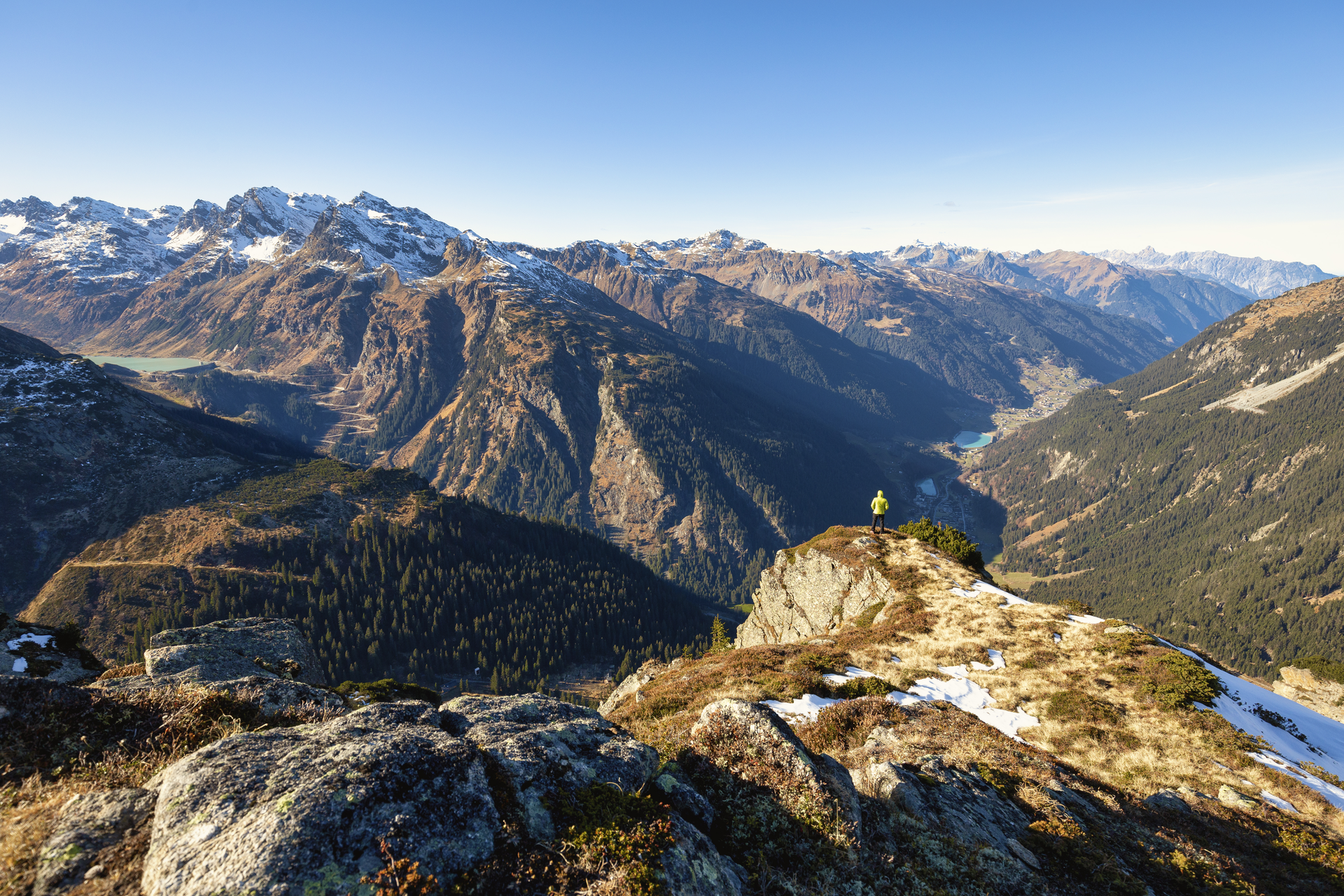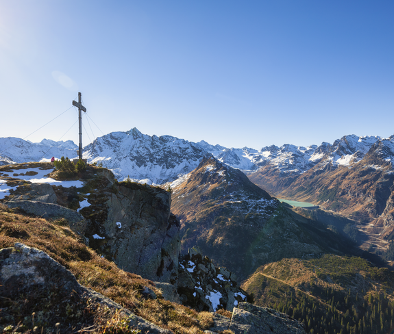 Auf dem Gipfel der Breitspitze wirst Du mit einer großartiger Aussicht auf die umliegenden Gipfel der Silvretta und ins Montafon belohnt.