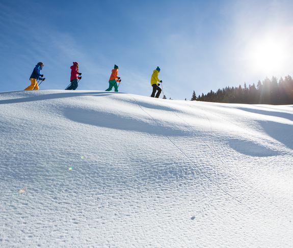 Snowshoes, telescopic poles with large baskets, avalanche equipment with transceiver, probe, and shovel, day hiking backpack (approx. 30 liters) with rain cover, possibly with avalanche airbag, comfortable and waterproof winter shoes or sturdy hiking boots that fit into the snowshoe bindings, gaiters if necessary, warm and durable clothing in multiple layers, ski jacket and pants, hat/headband, scarf, gloves, possibly ski goggles, sun and rain protection, provisions and drinking water, thermos with hot drink, first aid kit, pocket knife, mobile phone, possibly headlamp and reflectors, maps, bivouac sack, and rescue blanket.