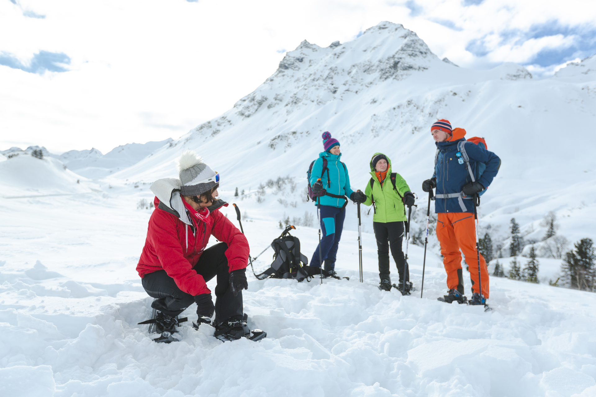 Snowshoes, telescopic poles with large baskets, avalanche equipment with LVS device, avalanche probe and shovel, day hiking backpack (approx. 30 liters) with rain cover, possibly with avalanche airbag, comfortable and waterproof winter boots or sturdy hiking boots that fit into the snowshoe bindings, possibly gaiters, warm and durable clothing in layered system, ski jacket and pants, hat/headband, scarf, gloves, possibly ski goggles, sun and rain protection, provisions and drinking water, thermos with hot beverage, first aid kit, pocket knife, mobile phone, possibly headlamp and reflectors, map material, bivouac sack and rescue blanket.