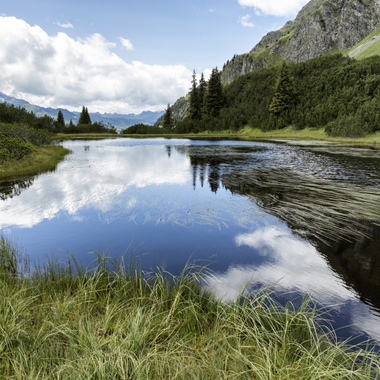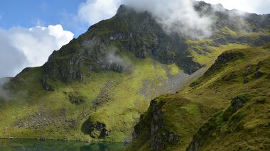 The Verwall captivates with its many small lake eyes, the water crystal clear, the surrounding landscape lush green.