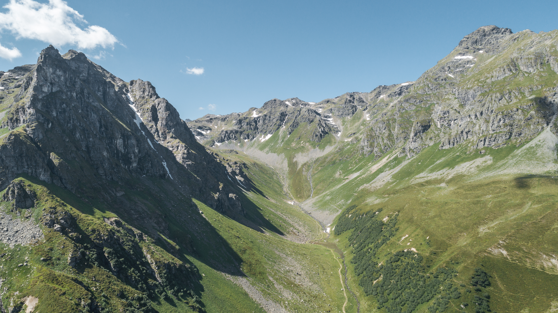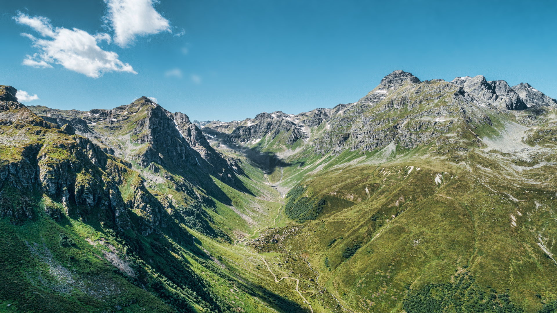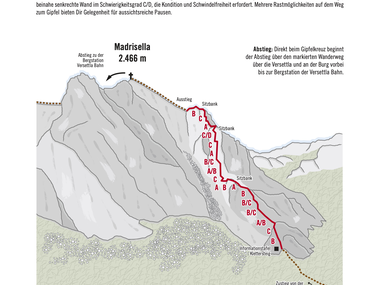 Now you turn left and – passing the cairns – follow the approx. 15 to 20-minute ascent to the starting point. An almost vertical wall is your first warm-up challenge and will place demands on your stability and arm muscles. After a short break, you will scale the next wall up to one of the highlights of the via ferrata: a rest bench embedded in the rock, where you can catch your breath and enjoy the view in comfort. Make good use of this break, because the most demanding part will be coming up after a short descent – the 150 metre-high, vertical wall. You’ll climb this wall with several metres of thin air under your feet. Remember to enjoy the surrounding idyllic panorama now and again! Having arrived at the top, a small plateau offers a place to rest. Follow the short ridge and start mounting the last wall of the via ferrata. After the last arduous part, a crosspath and the final, almost vertical metres to the end point await. After approx. 2.5 to 3 hours, the Madrisella via ferrata is completed.
