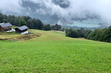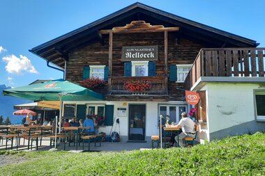 Energie pur spüren wir auch in den Beinen, die einfach treten wollen, um warm zu bleiben. Nach einigen Kehren entlang Wiesen und letzten Häusern biegen wir rund 800 Höhenmeter später auf einen Schotterweg ab. Und sehen es schon bald, das Alpengasthaus Rellseck. Und wer hätte das gedacht: Selbst beim Platzregen, der uns mittlerweile testet, hat die Hütte geöffnet! Vor der Tür schütten wir das Wasser aus unseren Schuhen und treten vorsichtig ein. Wir bekommen keinen Stubenarrest. Stattdessen finden wir uns sogleich vor dampfenden Tee- und Kaffeetassen wieder, begleitet von lockeren Sprüchen des sympathischen Hüttenpersonals. Von meinem nicht weniger sympathischen Guide erfahre ich viel über die Region und über seine Outdoor-Erlebnisse. Ich könnte ewig zuhören. Doch der Blick nach draußen zeigt: Es wird nicht besser, im Gegenteil, die Sicht wird schlechter.