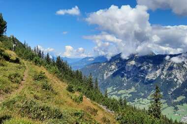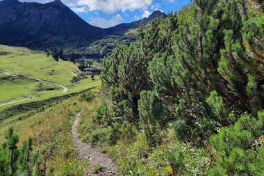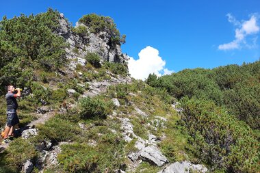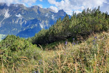 Wir steigen ein kurzes Stück am Wiesenhang hinab, mit Ausblick auf die Itonskopfgruppe und auf die Alpe Latons, um kurz darauf auf schmalem Pfad links abzubiegen. Es ist ein toller Weg; abwechslungsreich, inmitten vom satten Grün, Alpenblumen und Latschenkiefern – und ab und zu zeigen sich Gipfelkreuze vor uns: der Zwölferkopf und links versteckt unser Gipfel: die Davenna. Im leichten Auf und Ab ist der landschaftlich reizvolle Weg nie anstrengend, insgesamt sind bis zum Gipfel nur knapp 250 Höhenmeter zu bewältigen. Bald ein kurzer Anstieg über Gestein, das eine kleine Geschichte beherbergt. Wie ich von Michael erfahre, liegt hier eine der seltenen Stellen vor uns, wo Kalk mit Muschelschalen auf dem Flysch als Fossilreste zu finden sind. Zeitzeugen aus dem Meer, die vor 25 Mio. Jahren durch den Zusammenprall der Kontinente Afrika und Europa nach oben geschoben wurden.