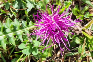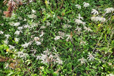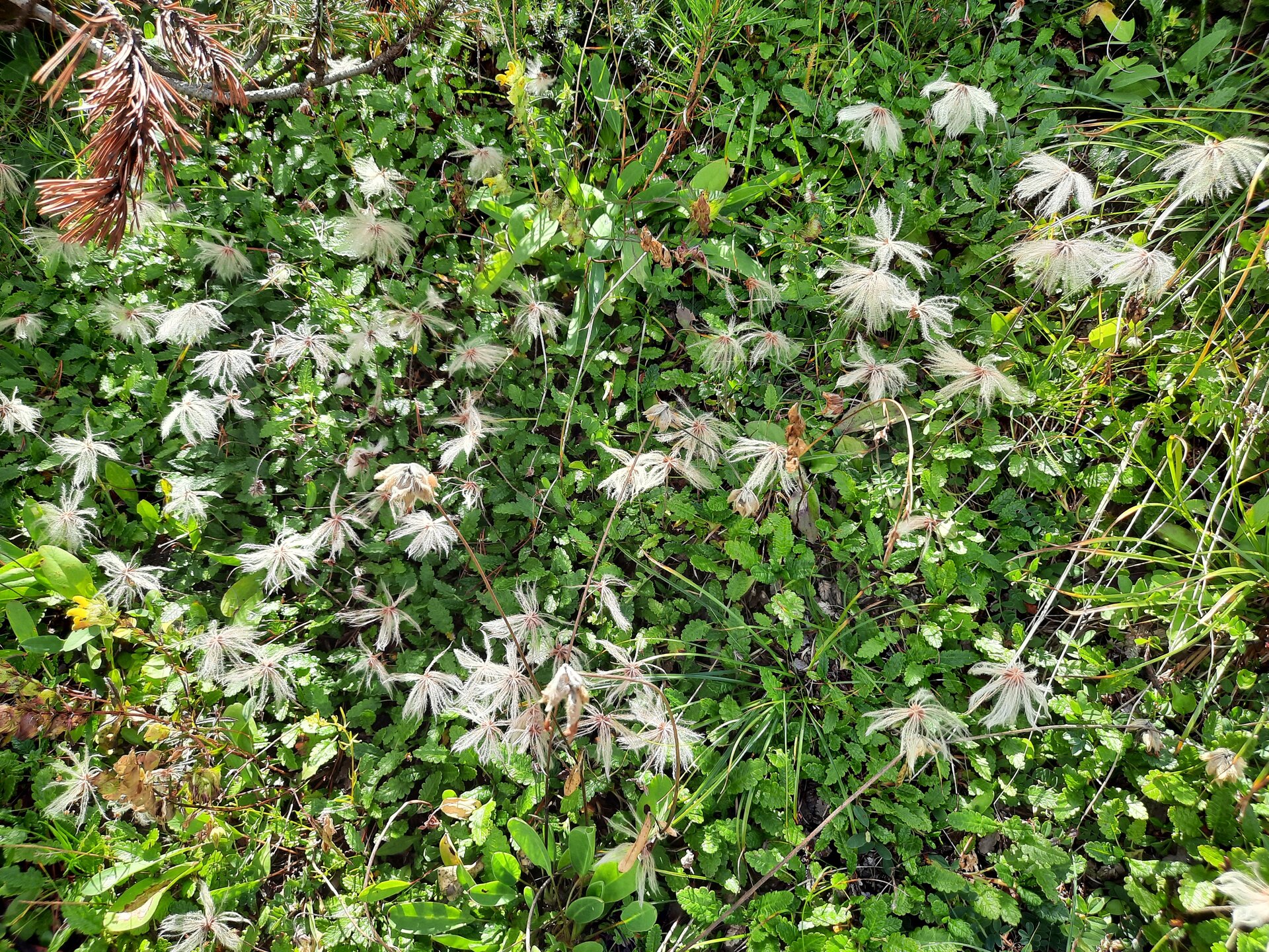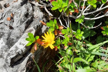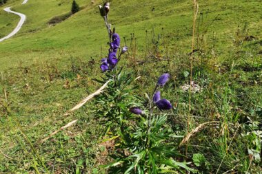 Beim Weg retour nehmen wir die vielen Blumen erst richtig wahr. Blaue Alpenglockenblume, Eisenhut, Silberdistel und gelbes Bergjohanniskraut. Ein Polster mit weißen strahlenförmig-dünnen Blüten fällt besonders in unser Blickfeld. „Das ist der gemeine Sternenstaub“, vernehme ich da von der Seite. Ich drehe mich langsam zu meinem Guide um und sehe seine nach oben gezogenen Mundwinkeln. Okay, wir beide müssen nochmal die Schulbank drücken. Der virtuelle Lehrer für die Hosentasche hat aber schon mal eine Lösung parat: Es könnte sich um die Alpen-Küchenschelle handeln.