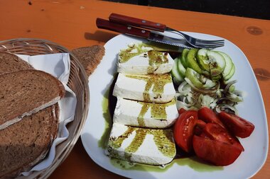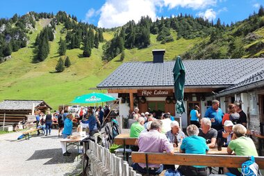 Das bringt mich dann auch gleich auf einen Gedanken: Eine Einkehr wäre jetzt genial! Das Alpengasthaus Rellseck wartet ja. Aber heute scheint unten auf der Alpe Latons ein Wanderfest zu sein. Wir hören Alphörner und sehen einige Wanderer und Einheimische bei regionalen Köstlichkeiten gemütlich zusammensitzen. Klar, dass wir dort mal schnell vorbeischauen wollen, mit E-Bikes ist man ja auch fix wieder oben. Michael erklärt dabei, dass er mit seinen Gästen weitegehend flexibel reagieren kann. Wenn man hier an der Alpe Latons kurz vorbeischauen will, ist das auch okay. Oder wenn hier einige warten wollen, während die anderen mit dem Guide zur Davenna laufen.