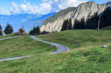 Zurück geht’s mit dem E-Mountainbike zum Rellseck, wo der Montafoner Sura Kees und ein Johannisbeerschorle locken. Mit frischer Power fahren wir anschließend auf dem Schotterweg mit spannender Variante hinunter bis nach Bartholomäberg. Vorbei an der barocken St. Bartholomäus Kirche mit der Zwiebel auf dem Turm, bis wir an Infotafeln gelangen. An dieser Stelle, im Friagawald, kamen bei Ausgrabungen eine bronzezeitliche Burganlage und Siedlung zum Vorschein.