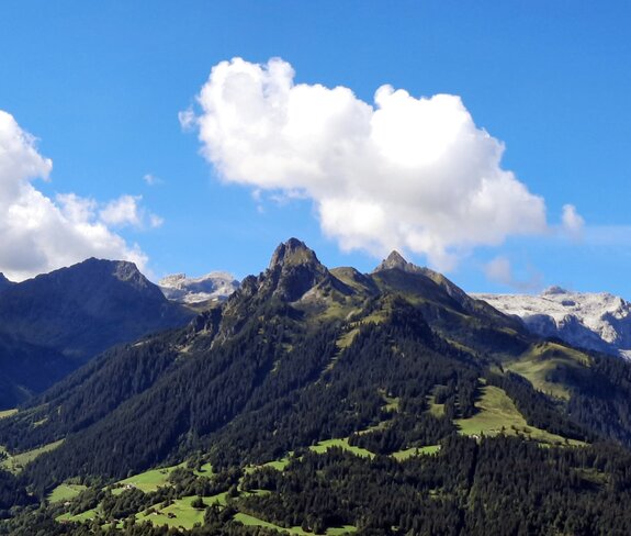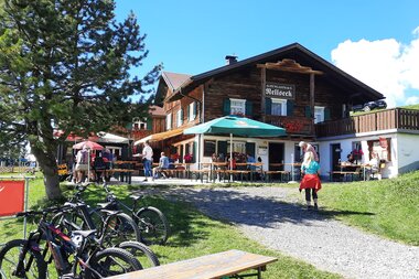 Sonntag. Der Name ist Programm. Unter strahlendem Sonnenschein biken wir erneut über Bartholomäberg, dem „Sonnenbalkon des Montafon“, zum Alpengasthaus Rellseck. Dieses Mal zeigen sie sich in ihrer vollen Pracht: die weiten Maisäßlandschaften, Hochtäler und Gipfel von der Silvretta bis zum Rätikon. „Wenn die Gäste hier bereits eine Rast machen möchten, ist das natürlich möglich“, sagt Michael. Wir fahren weiter.