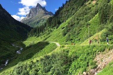 Auf dem letzten Viertel spüre ich meine Kräfte schwinden, das lange Bergablaufen belastet Muskeln und Gelenke ordentlich. Ich denke wieder an die Wanderung am Vortag und die Kräutertipps meiner Wanderführerin. Farn, Arnika, Breitwegerich, Wildthymian, alles und vieles mehr blüht hier am Wegesrand. Doch heute brauche ich keine Linderung, die Reserven reichen für ein anständiges Finale. Durch das hintere Silbertal, vorbei an der Unteren Gaflunaalpe, dem Alpengasthaus Fellimännle und dem wilden Teufelsbach-Wasserfall rolle ich die letzten Kilometer leicht bergab in den Zielort, wo ich mich nach einer kleinen Schleife durch Silbertal unter herzlichem Applaus als stolzer Finisher feiern lassen darf. Wieder stellen sich Rieseln und Gänsehaut ein. Wieder überkommen mich Emotionen.