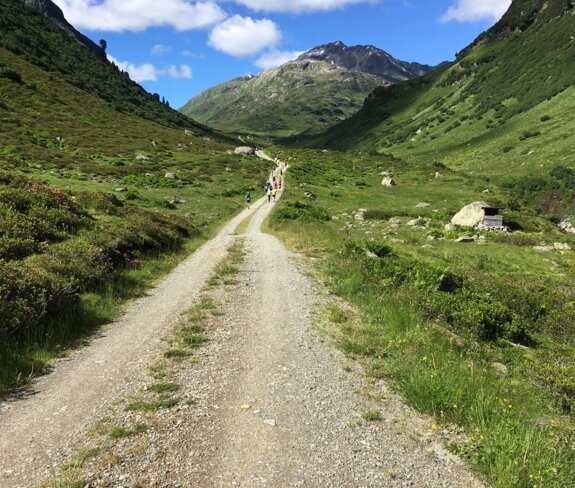 ... mitten in den Himmel, so hat es den Anschein. Höher und höher bewegen wir uns in einer Kette, die nicht abreißen will. Mehr als 400 Läuferinnen und Läufer bilden ein farbenfrohes Szenario. Auf dem höchsten Punkt der Strecke, beim Schönverwall auf 1.950 Metern, wartet eine neue Herausforderung. Die Regenfälle vom Vortag haben die hochalpine Landschaft in ein Potpourri aus saftigen Wiesen, dunkelbraunem Morast, rauschendem Wasser und rutschigen Steinen verwandelt, für mich wird jeder Schritt zum kräfteraubenden Tanz mit dem Gleichgewicht.