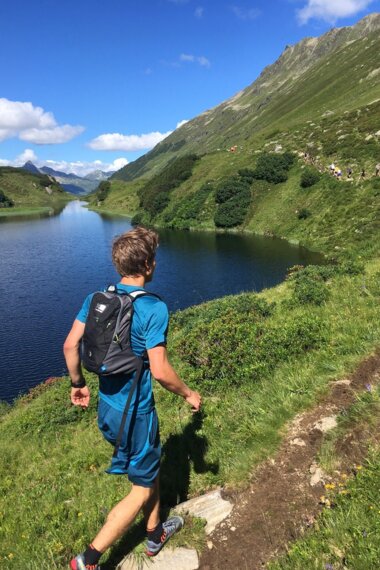 Nach dem Start verlassen die Läuferinnen und Läufer St. Anton in Richtung Rosannaweg. Ich bin mittendrin und lasse es ruhig angehen. Nach einem ersten herausfordernden Kilometer durch die an diesem Tag überaus feuchte Rosannaschlucht finde ich meinen Rhythmus und konzentriere mich auf den langen Anstieg vorbei am Verwallsee durch das Verwalltal.