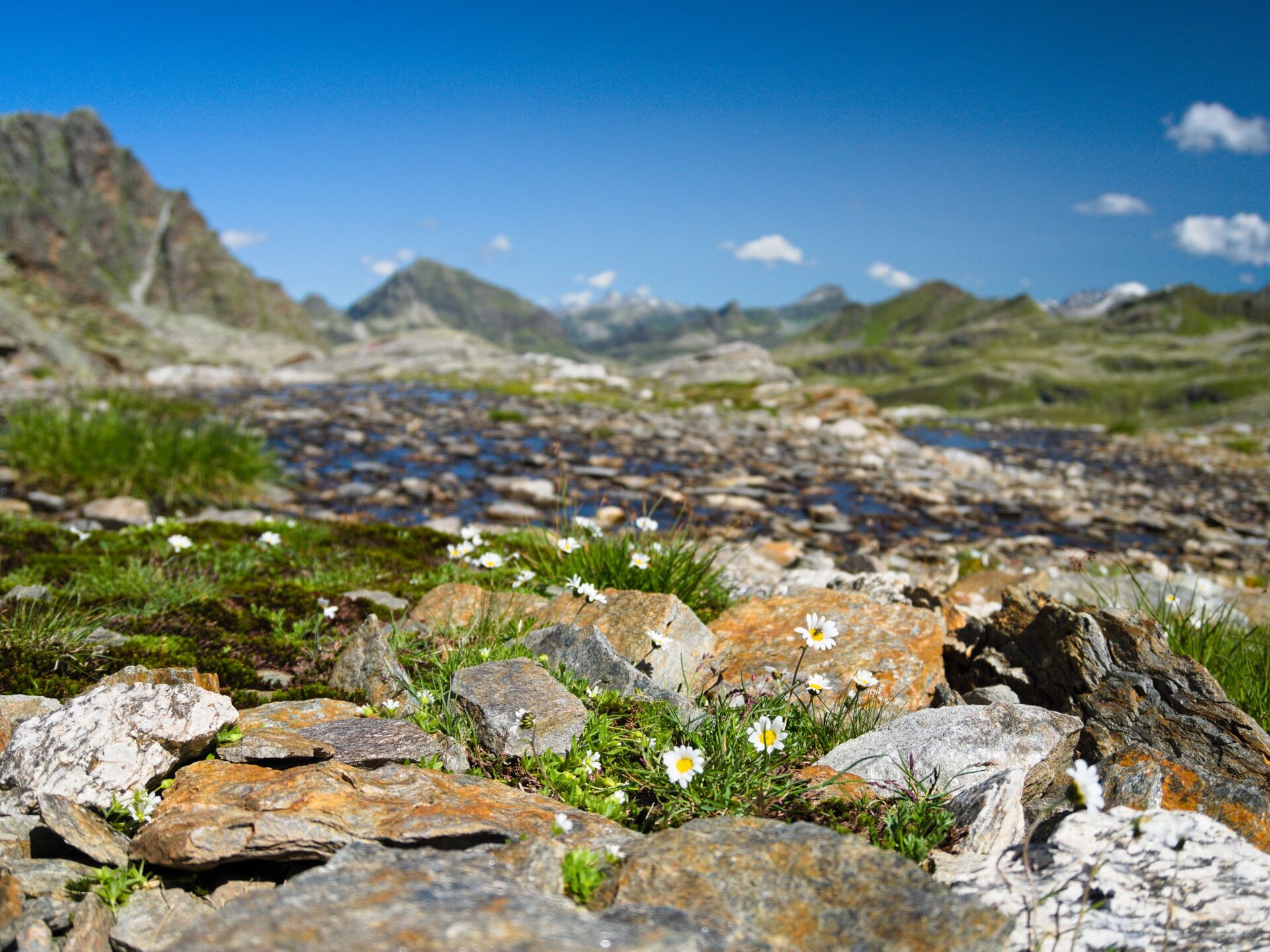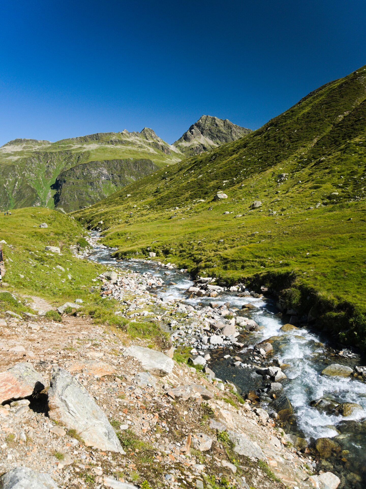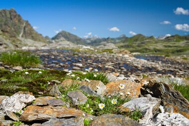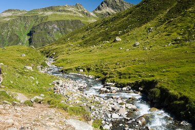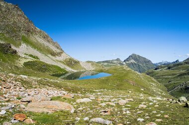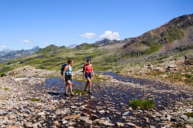 Die ersten Kilometer durch das Bieltal sind entspannt und idyllisch. Wir folgendem dem Lauf des Bieltalbachs, der sich durch den grünen Talboden schlängelt. Manchmal wird der Bachlauf durch Felsen verengt und verändert der plätschernde Bach in einen rauschenden Wasserfall. Wir merken kaum, dass wir schon Höhenmeter machen. Aber das ändert sich bald, als wir den Abzweig zum Radsattel nehmen. Plötzlich geht es rasch bergauf. Am Radsee halten wir inne für eine kleine Verschnaufpause. „Gleich wird die Tour noch etwas alpiner“, erzählt Catharina, „Wir überqueren große Felsblöcke. Es gibt eine alte und neue Wegführung. Ich zeige euch vor Ort, wie ihr den Hang am besten quert.“ Die Kraxelei ist toll, aber ungefährlich - genau wie ich es mag. Und der Ausblick wird mit jedem Schritt schöner. Der buchstäbliche und bildliche Höhepunkt erreichen wir am Radsattel mit 2.654 Meter, dem höchsten Punkt der Wandertour.
