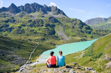 Am türkisblauen Silvrettasee hält der Bus. Der 1,31 km² große Stausee liegt auf einer Seehöhe von 2.030 m auf dem ehemaligen Ochsenboden, einer Senke der Silvretta. Am nördlichen Ufer treffen wir die Bergwanderführerin Catharina und die kleine Gruppe, mit der wir heute auf dem Hohes Rad Rundweg unterwegs sind. Catharina zeigt uns, wo es hingeht. Am südöstlichen Ufer thront das Hohe Rad hoch über die Seeoberfläche. „Wir wandern durch das Bieltal an der östlichen Seite hinauf zum Radsattel. Da machen wir eine längere Pause“ fängt sie an, „Danach geht es runter zur Wiesbadener Hütte und durch das Ochsental an der anderen Seite vom Berg wieder zurück zum See.“ Klingt nach einem guten Plan, also los geht’s!