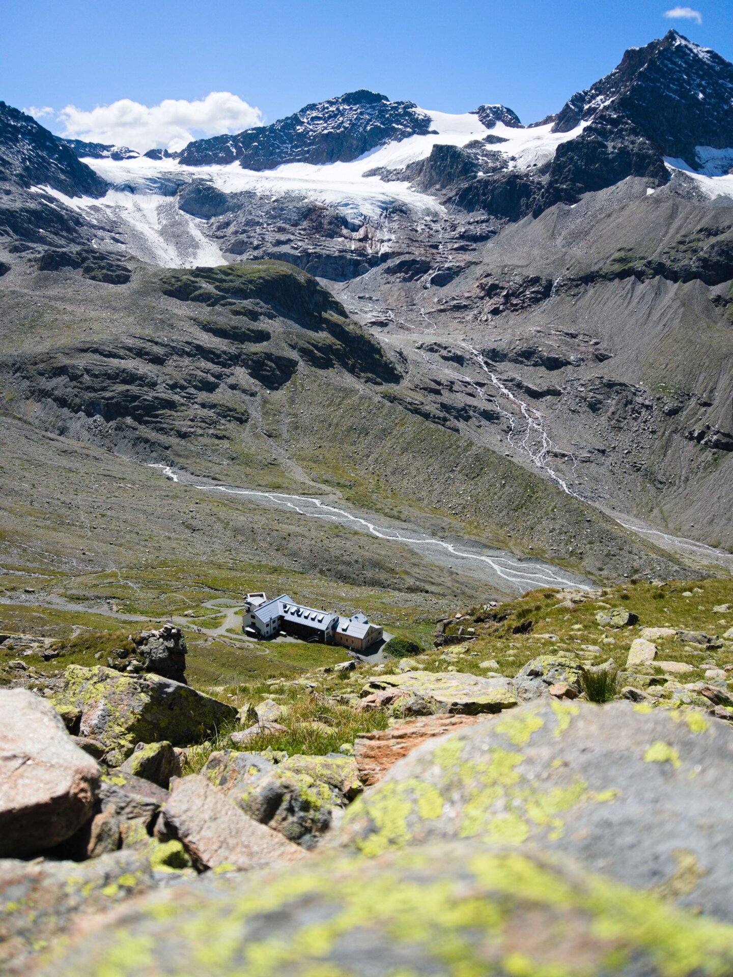 Die Wiesbadener Hütte lockt: Abstieg mit dem Piz Buin im Blick