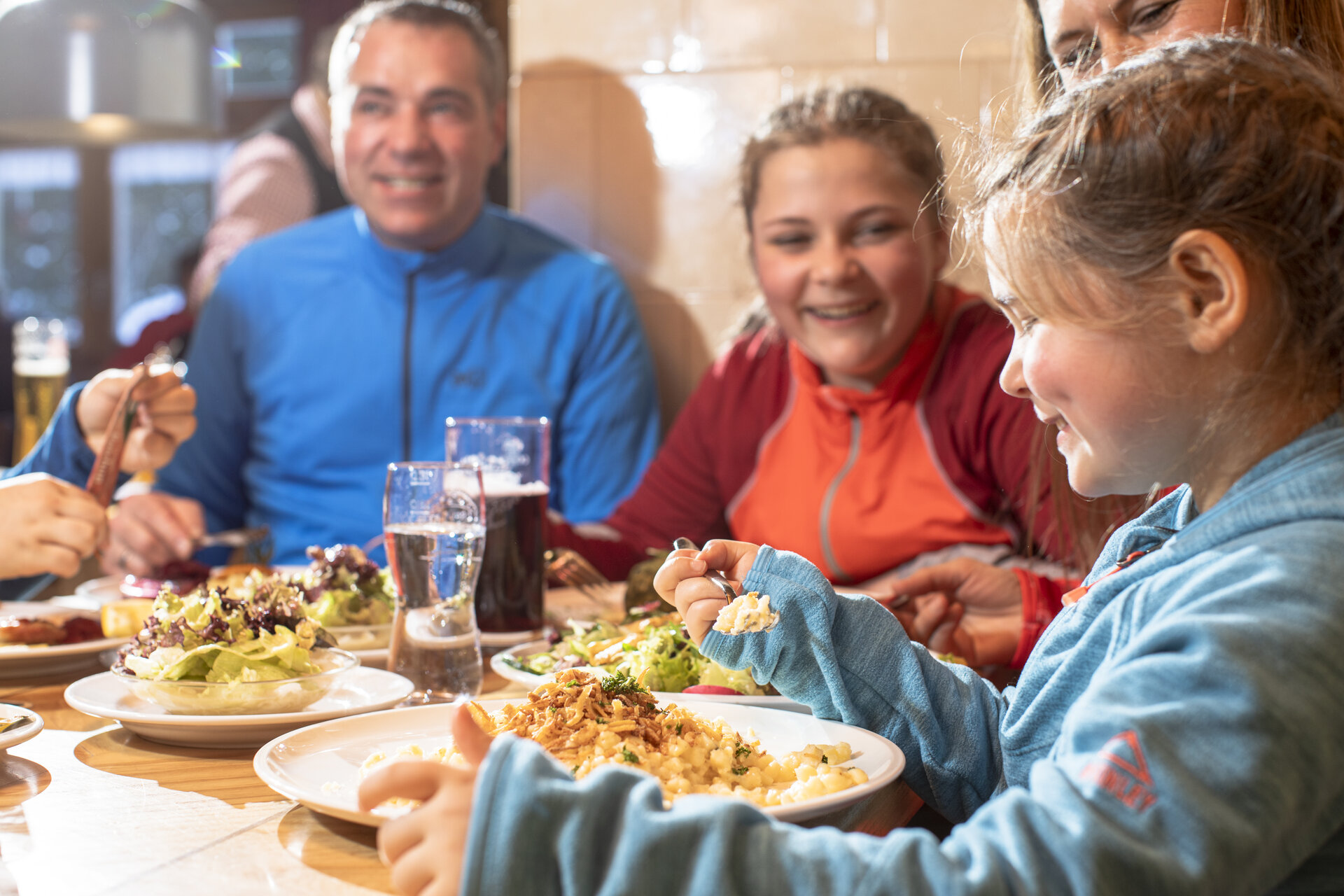 Hier in der gemütlichen Gaststube mit Kachelofen serviert Hüttenwirt Manfred gemeinsam mit seiner Frau Silvia feine regionale Köstlichkeiten. „Unsere kulinarische Spezialität sind natürlich Klassiker wie der Kaiserschmarrn. Sehr beliebt sind auch unsere Spinatknödel, das Gulasch von der Hirschkuh oder vom Reh - hier kommen die Tiere ausschließlich aus dem Gauertal - und unser Bauernsalat mit Suram Kees von der Alpe Spora“, berichtet uns Manfred, der die Hütte 2019 übernommen hat.