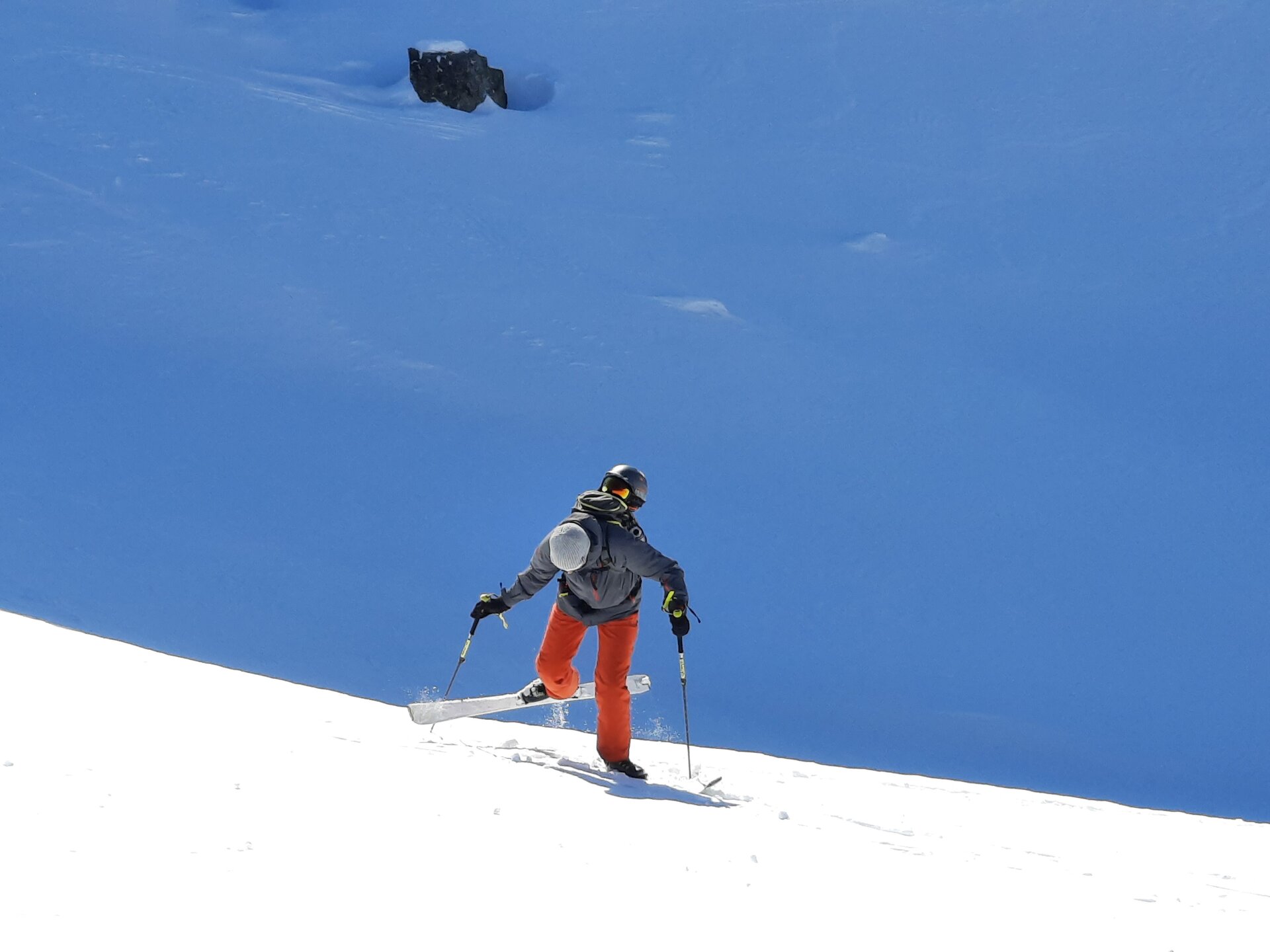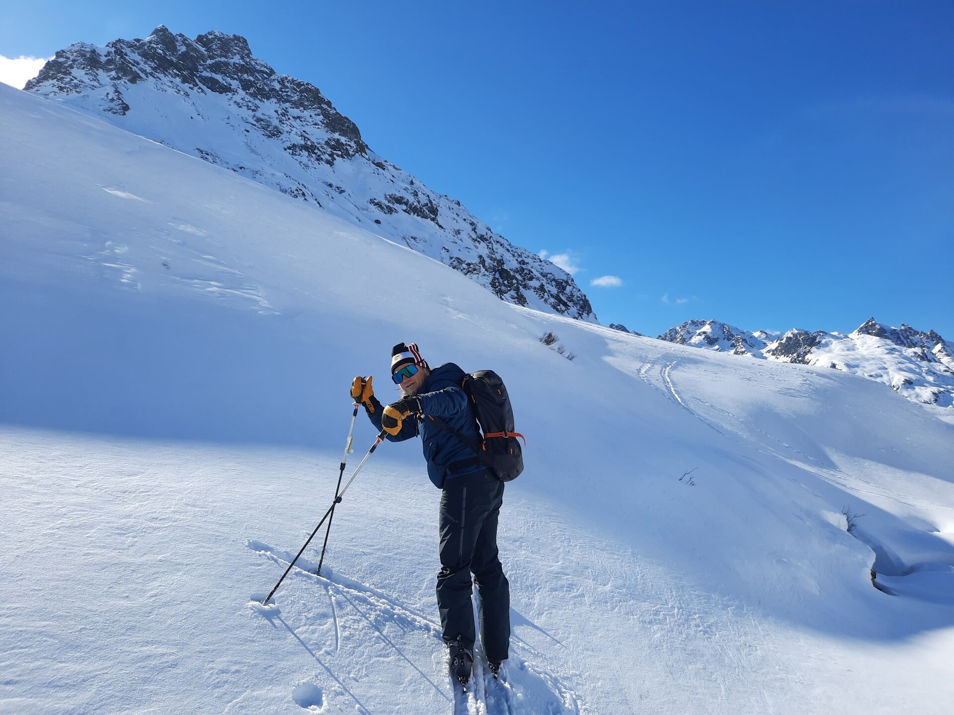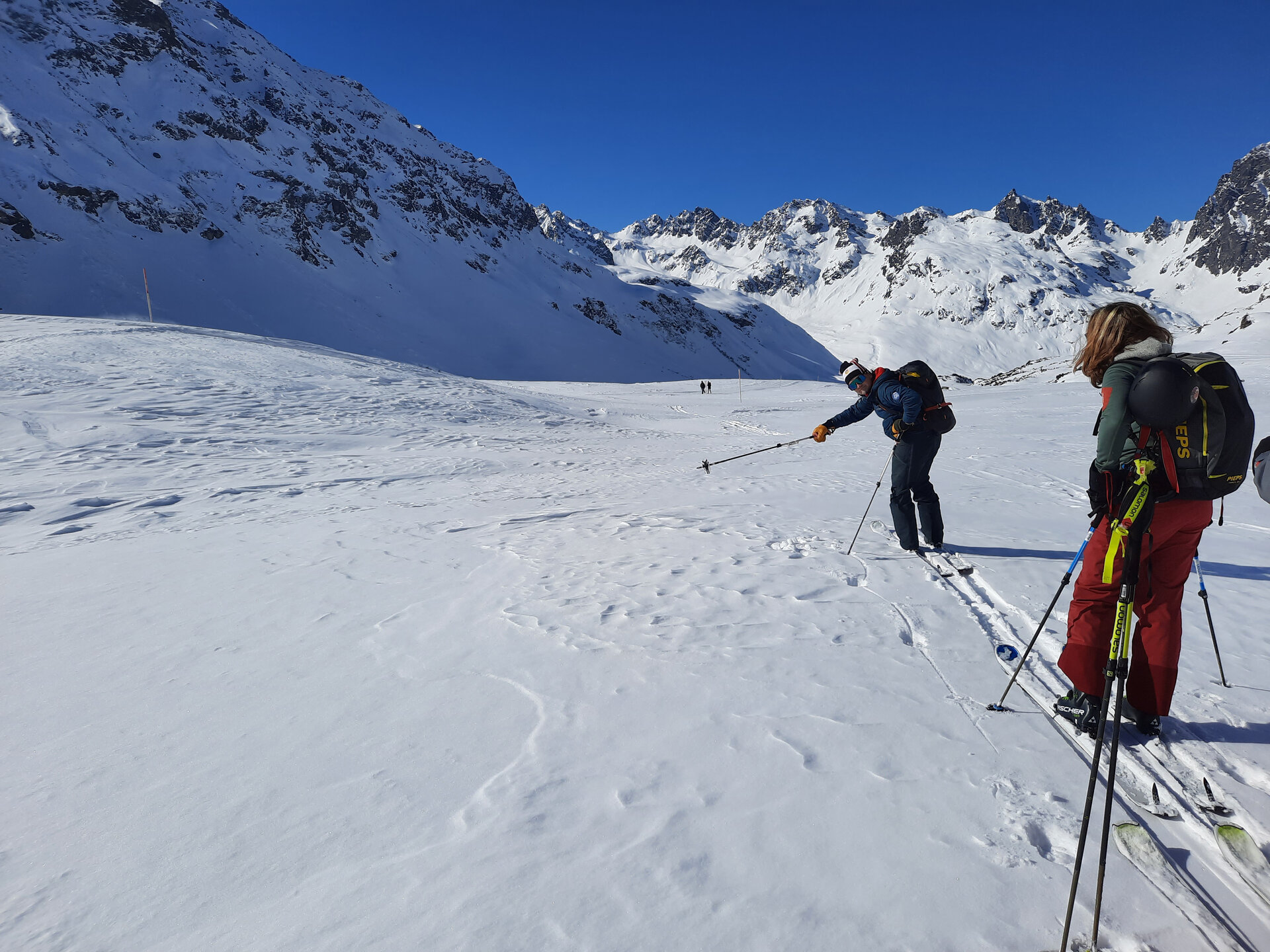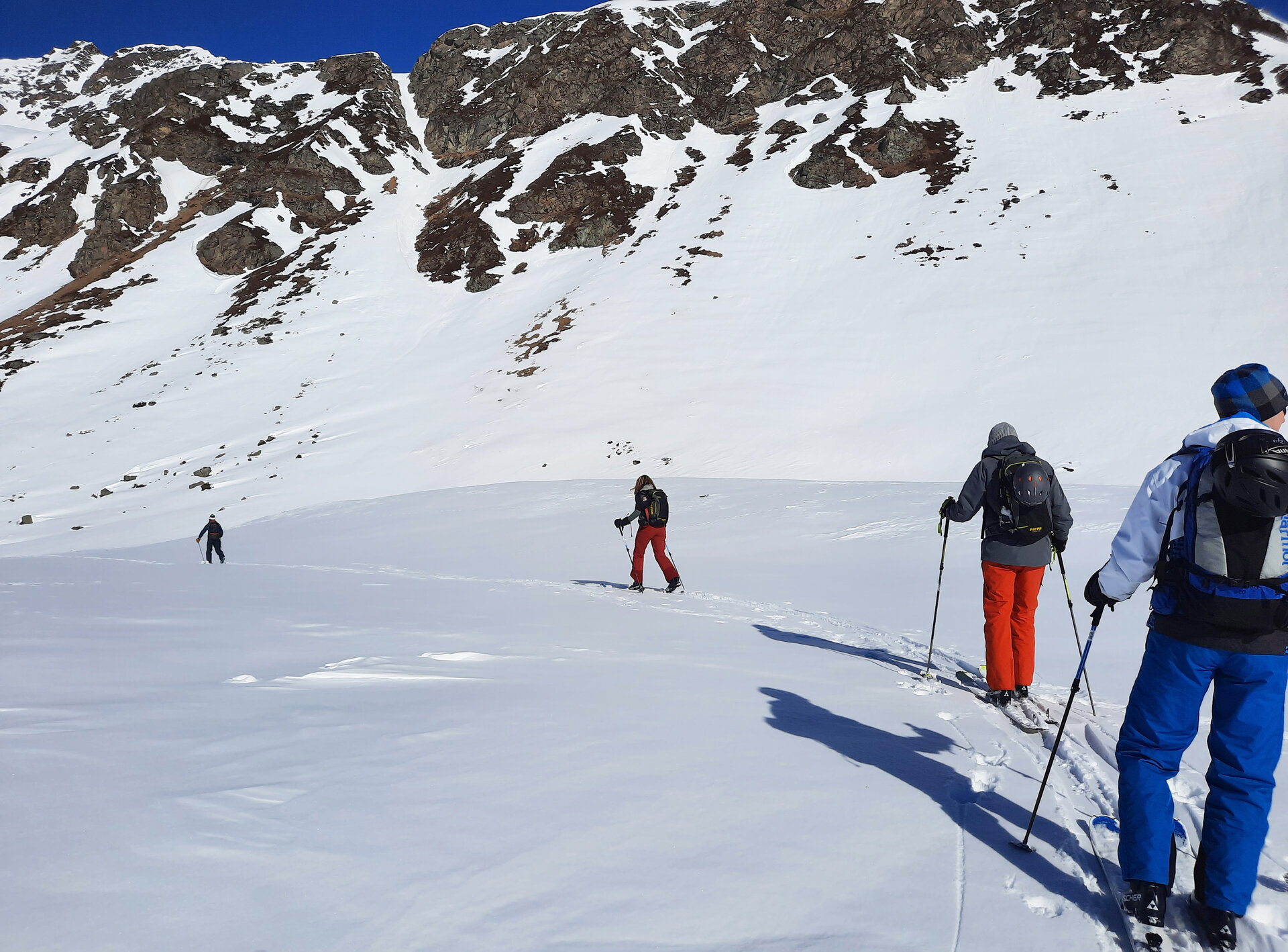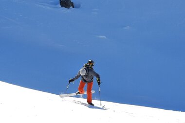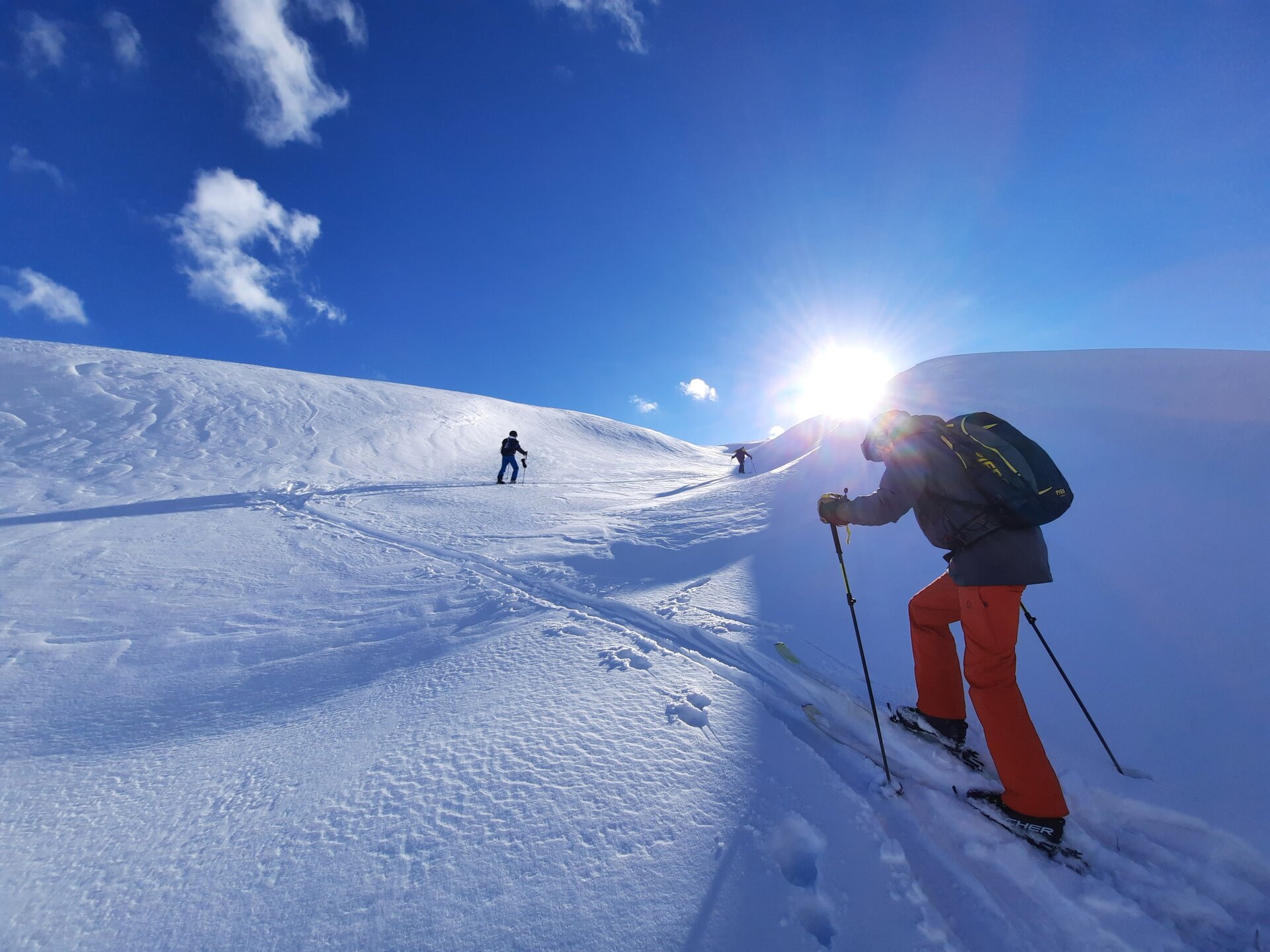 Plötzlich hält Jonny und meint: „Jetzt fahren wir Ski". Eine schönere Ansage hätte er nicht machen können, schließlich stehen wir vor unverspurten Tiefschneehängen, die sich über sanfte Hügel nach unten ziehen. Ein paar Schwünge, und man ist im Rausch. Herzklopfen. Wir schauen uns an und nicken: Ja, noch weiter hinab, in Richtung Paznautal. Man hätte noch ewig die flach abfallenden Powder-Hänge hinabschwingen können, doch es ist schon Nachmittag. Also wieder Felle aufziehen und hochstapfen zwischen Schneehügeln. Man fühlt sich in einer anderen Welt, umgeben vom einheitlichen Weiß, das sich im Sonnenlicht glitzernd vom dunkelblauen Himmel abhebt.