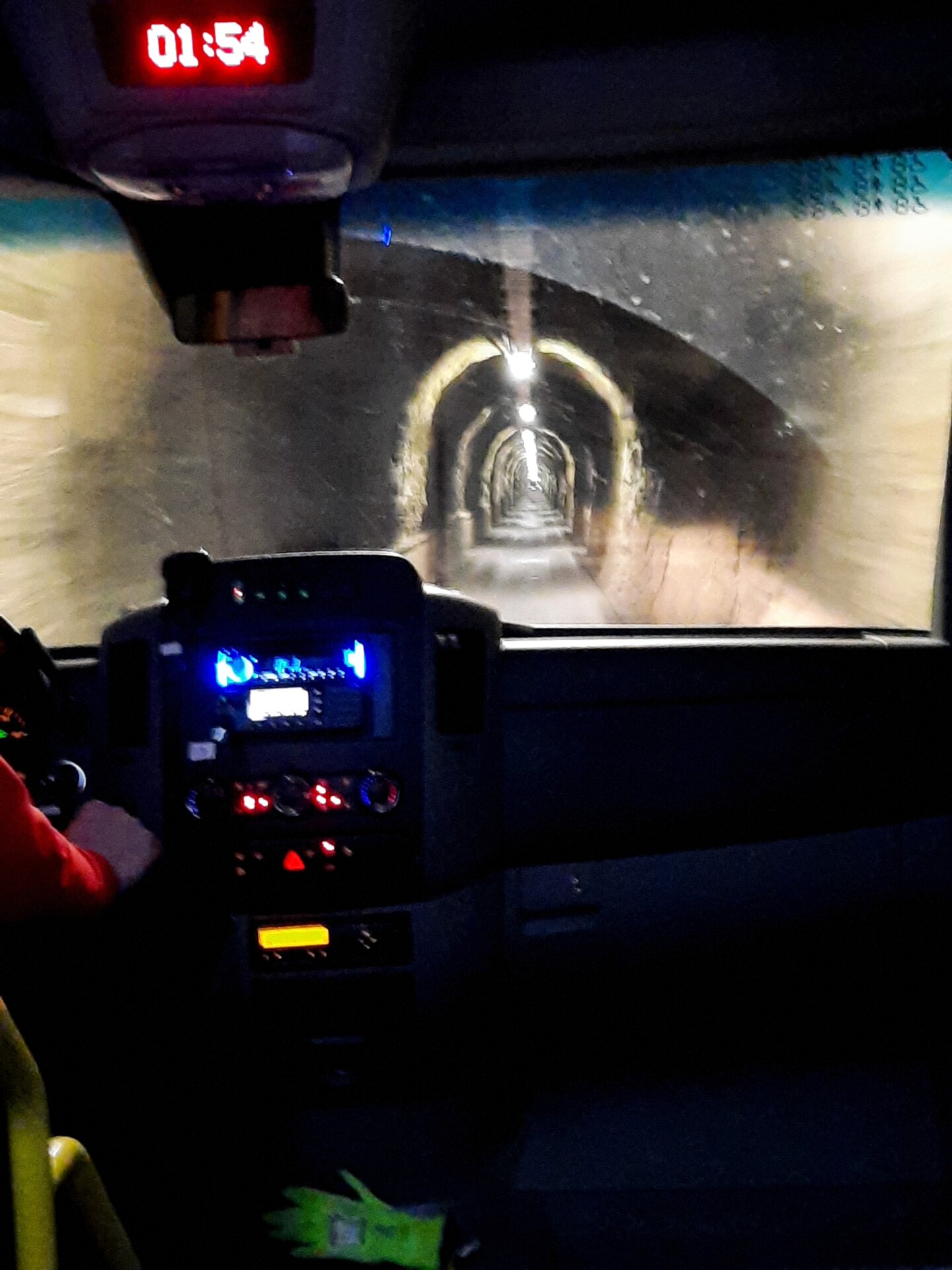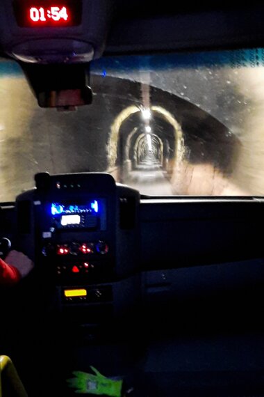 Spannung bis zur letzten Minute: Gerade noch rechtzeitig kommen wir zur Bushaltestelle, um das letzte „Tunneltaxi“ für heute zu bekommen. Der Busfahrer ist bestens gelaunt, die Insassen noch mehr. Kein Wunder, sie sind Endorphin-getränkt und schwelgen in Gedanken. Zumindest bis der Busfahrer mit kaum abgebremstem Tempo in den schmalen Stollen sticht – der wenige Zentimeterabstand links und rechts scheint wohl in seinen Genen verankert. Kaum drin, hält er doch: Das Tor wird zugezogen, der Tunnel hat für heute Feierabend (es sei denn, man hat Lust auf ein mind. 150-€-Ticket für eine Spätrettung).