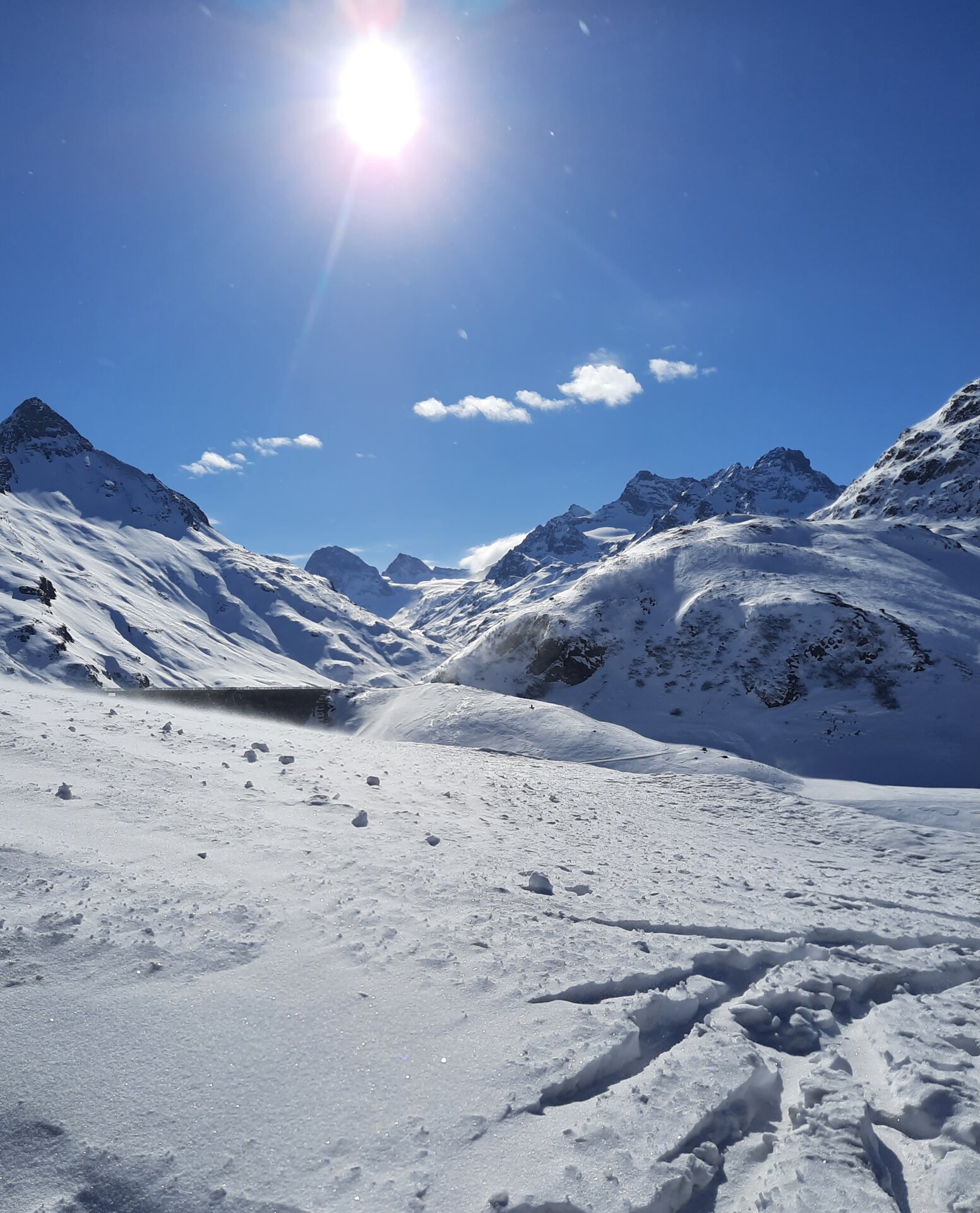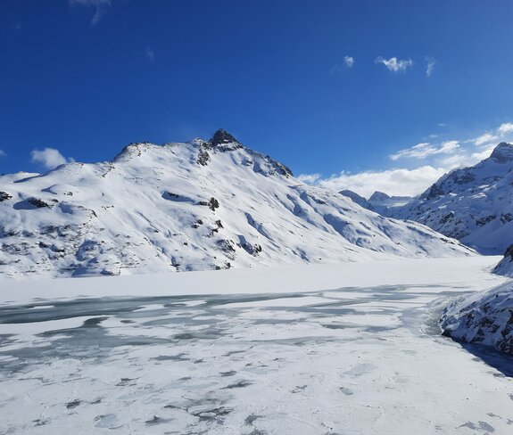 Der Blick ganz oben auf der Passhöhe, die das Vorarlberger Montafon mit dem Tiroler Paznaun verbindet – er nimmt einem den Atem. Umgeben vom Weiß, ganz im Off, rundum Gipfel – und Stille. Noch im Sommer auf der Silvretta-Hochalpenstraße mit dem Bike immer wieder von Autos, Motorrädern und Bussen überholt, herrscht jetzt im tiefverschneiten Winter einfach nur Ruhe und Idylle. Kaum Menschen, kein Fahrzeug. Kein Wunder, hier kommt man nur abenteuerlich hoch.