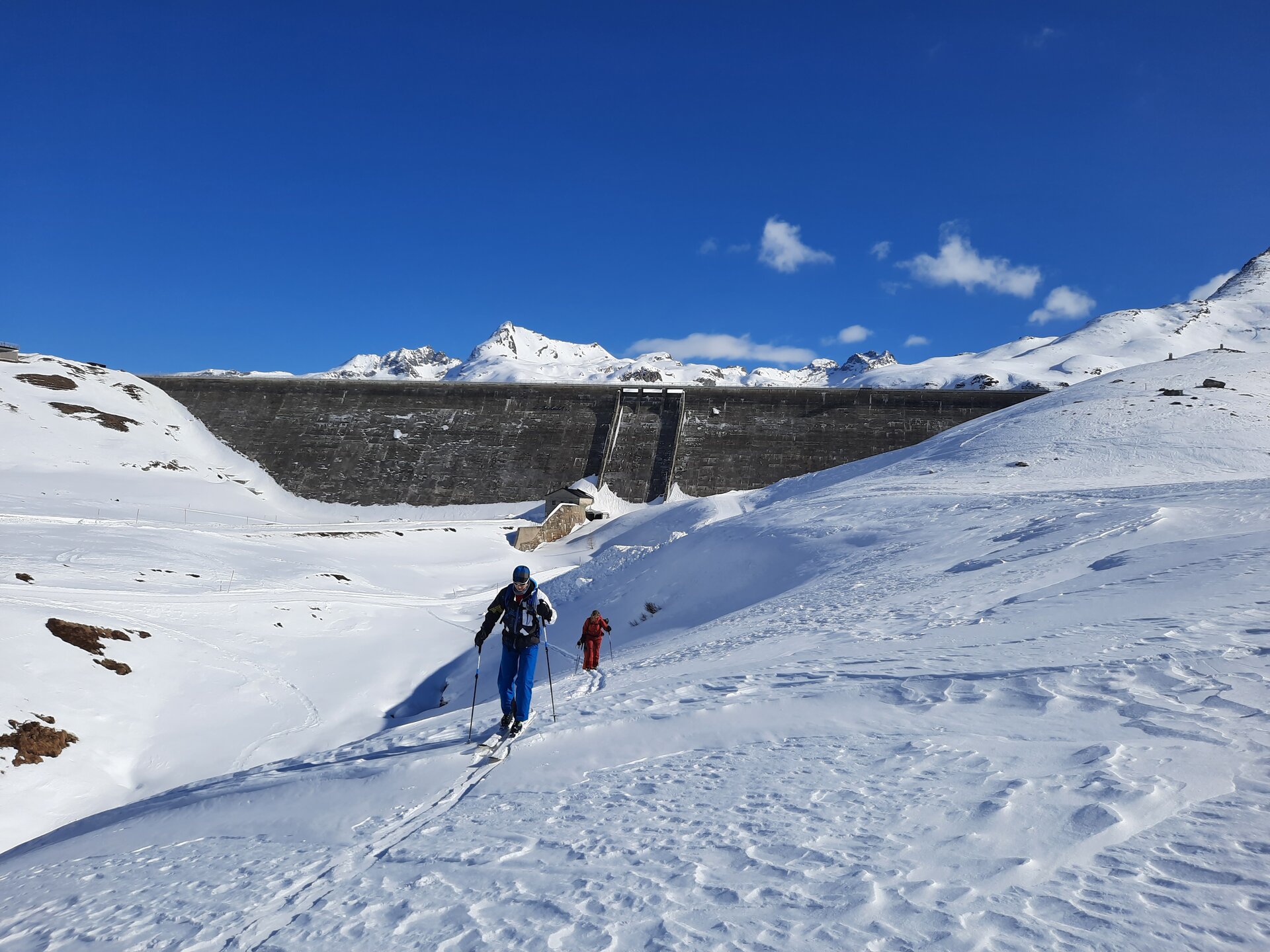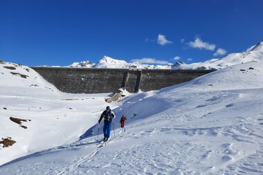 Wird es etwas steiler, kann man die Steighilfen nach oben stellen, was hintenraus PS bringt. Unser Anstieg ist jedoch moderat, die Staumauer des Silvretta-Stausees kommt schnell näher und wir können die Haken und Drahtseile an der riesigen Staumauer ausmachen: Dort gibt es nämlich einen Klettersteig. James Bond hätte gar nicht springen müssen.