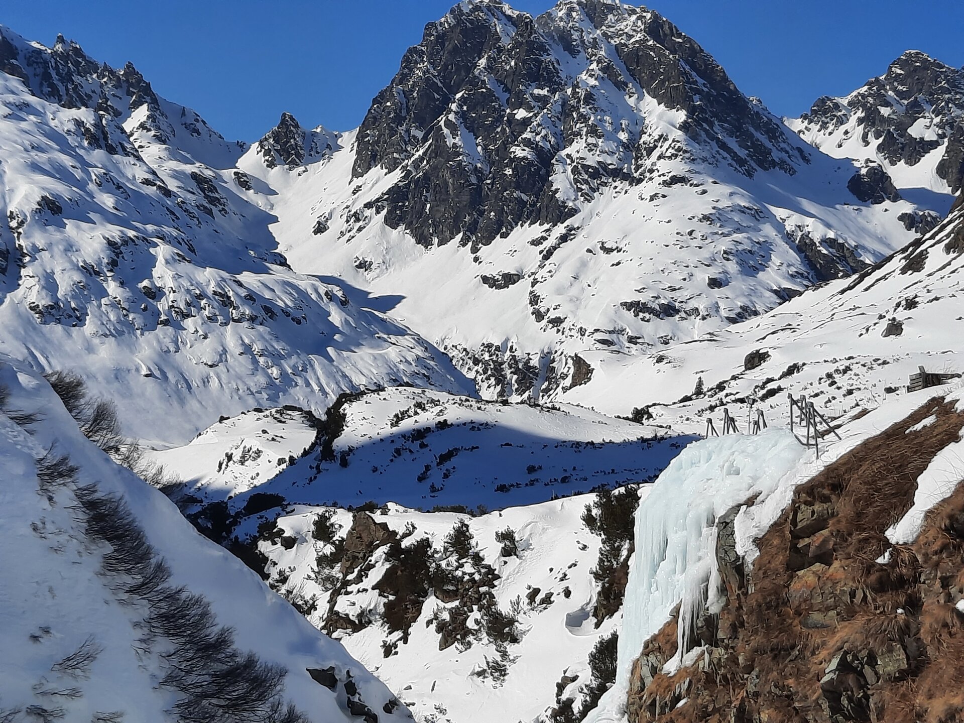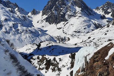 So gesellig ein Mittagessen auf der Hütte ist, es juckt uns unter den Nägeln und wir freuen uns auf die weitere Tour. Beim weiteren Aufstieg lernen wir noch die Neigungswinkel-Messfunktion der App und dass an Hängen, an denen der Fels zum Vorschein kommt, die Neigung ca. 40° beträgt. Apropos brutale Hänge: Beim Blick zurück erkennt man den gefrorenen Wasserfall, an dem man Eiskletterkurse buchen kann.