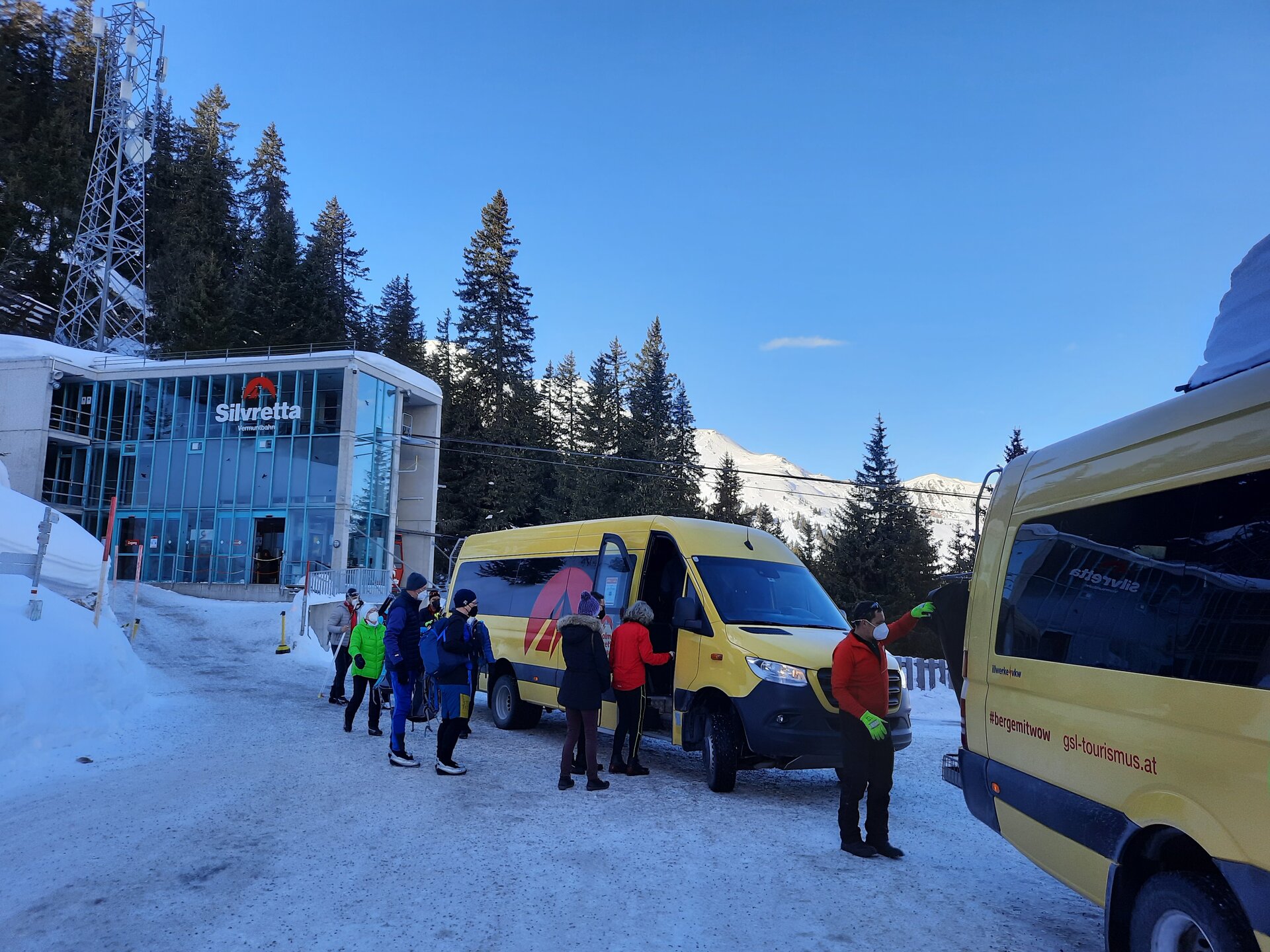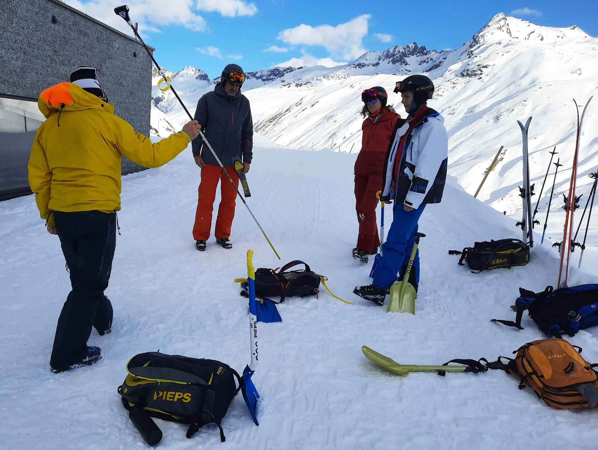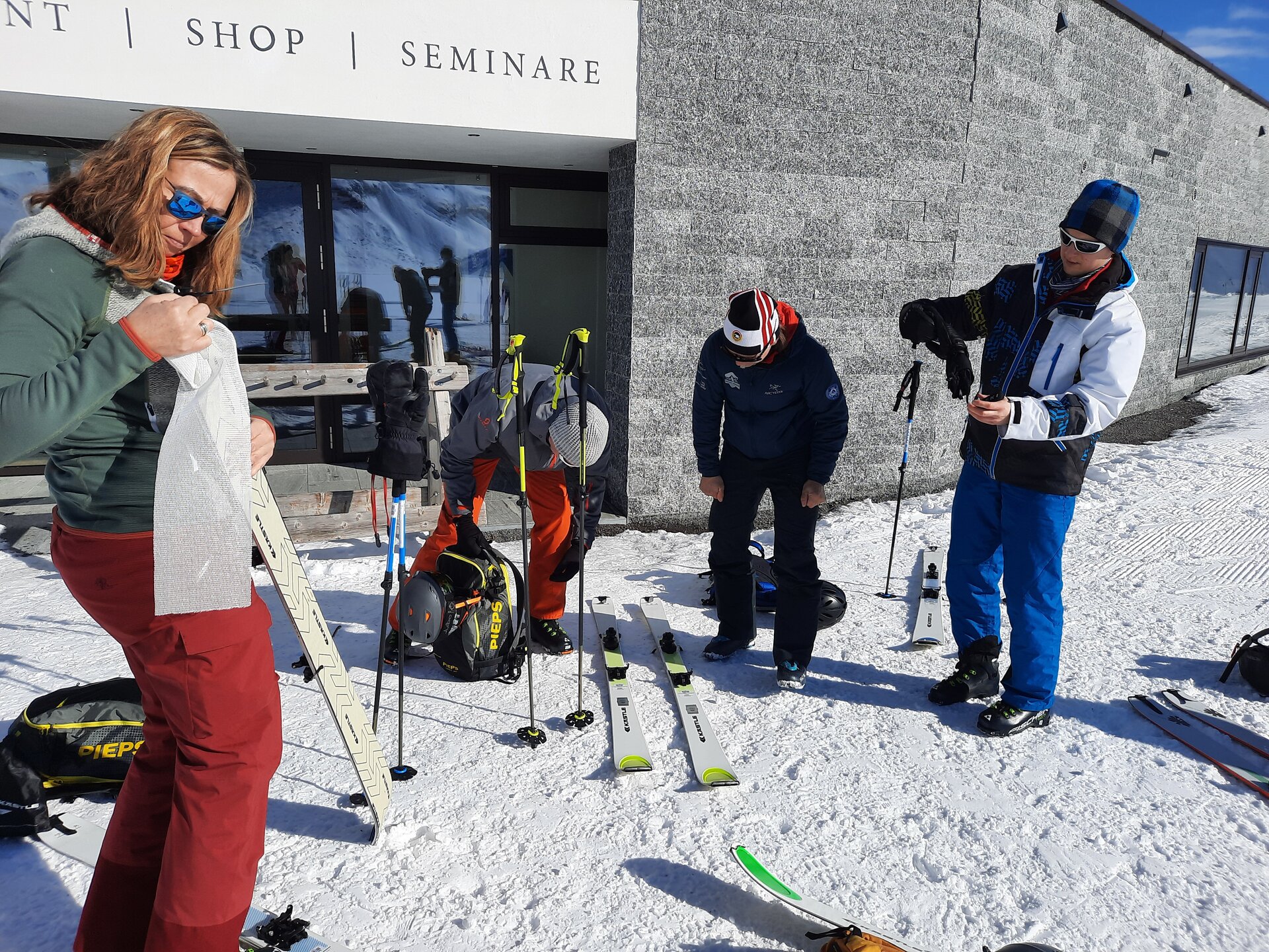 Treffpunkt ist bei Sport Stöckl in Partenen. Unser Bergführer ist schon da – wie cool, es ist Jonny, servus! Mit ihm hatte ich schon mal einen Bergsteigerkurs ausgehend von der Saarbrücker Hütte gemacht. Spaß, professionelles Engagement und viel Wissensvermittlung sind also vorprogrammiert. Der Service bei Ausrüstungsverleih Stöckl ist spitze: Schuhe und Tourenski werden sorgsam ausgesucht und die Funktion ausführlich erklärt. Und prompt steht auch der Tourenrucksack inklusive Felle, Sonde, Schaufel und LVS-Gerät bereit. Einsteiger machen gleich eine neue Erfahrung, fast schon als neue Lebenseinstellung: Vergiss all den Schmarrn, den man sonst so mit sich schleppt und stecke nur noch Sonnencreme, Smartphone und Geldbeutel ein. Achso, ja, ein Mittagessen mit Getränk sind im Programm dabei :).