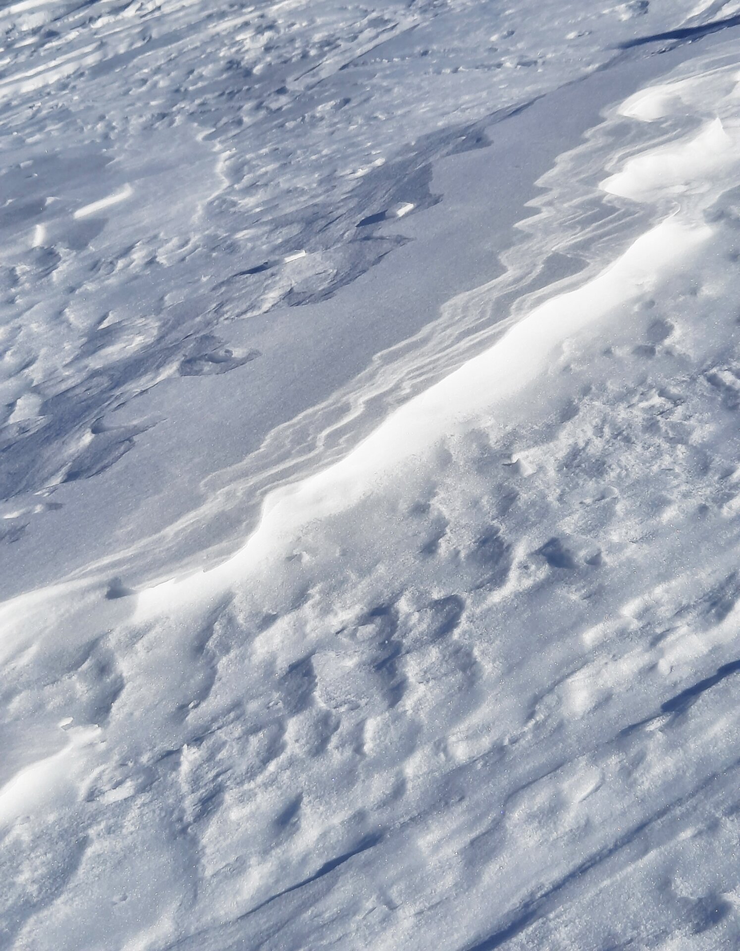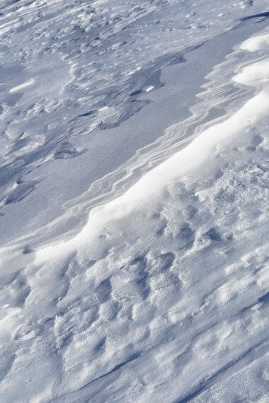 Es wird bissig: Wir lernen, wie man die Zeichen im Schnee interpretiert. Was sagen uns die Haifischzähne? Aus welcher Richtung kommt der Wind? Wir zeigen den Zähnen unser schönstes Lächeln und gehen im Abstand davon, dankbar um Spurenleger Jonny.