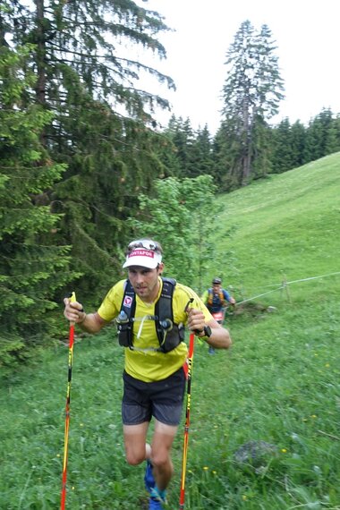 Der Start erfolgte um 07:00 Uhr in Schruns, ich kannte den ersten Streckenabschnitt in Schruns leider nicht, dennoch reihte ich mich nach dem Start gleich ganz vorne ein. Ich fühlte mich gut und meine Beine fühlten sich leicht an. Dennoch wusste ich nicht, ob ich das Tempo mitlaufen soll oder nicht. Ich blieb aber weiterhin hinter dem Führenden Eric Leidenfrost und merkte wenig später, dass mir das Tempo fast zu langsam wurde. Wir mussten immer wieder den ein oder anderen Weidezaun öffnen, kurz vor dem Maisäß Lifinar überholte ich Eric, als er Probleme hatte beim Öffnen eines Zaunes.