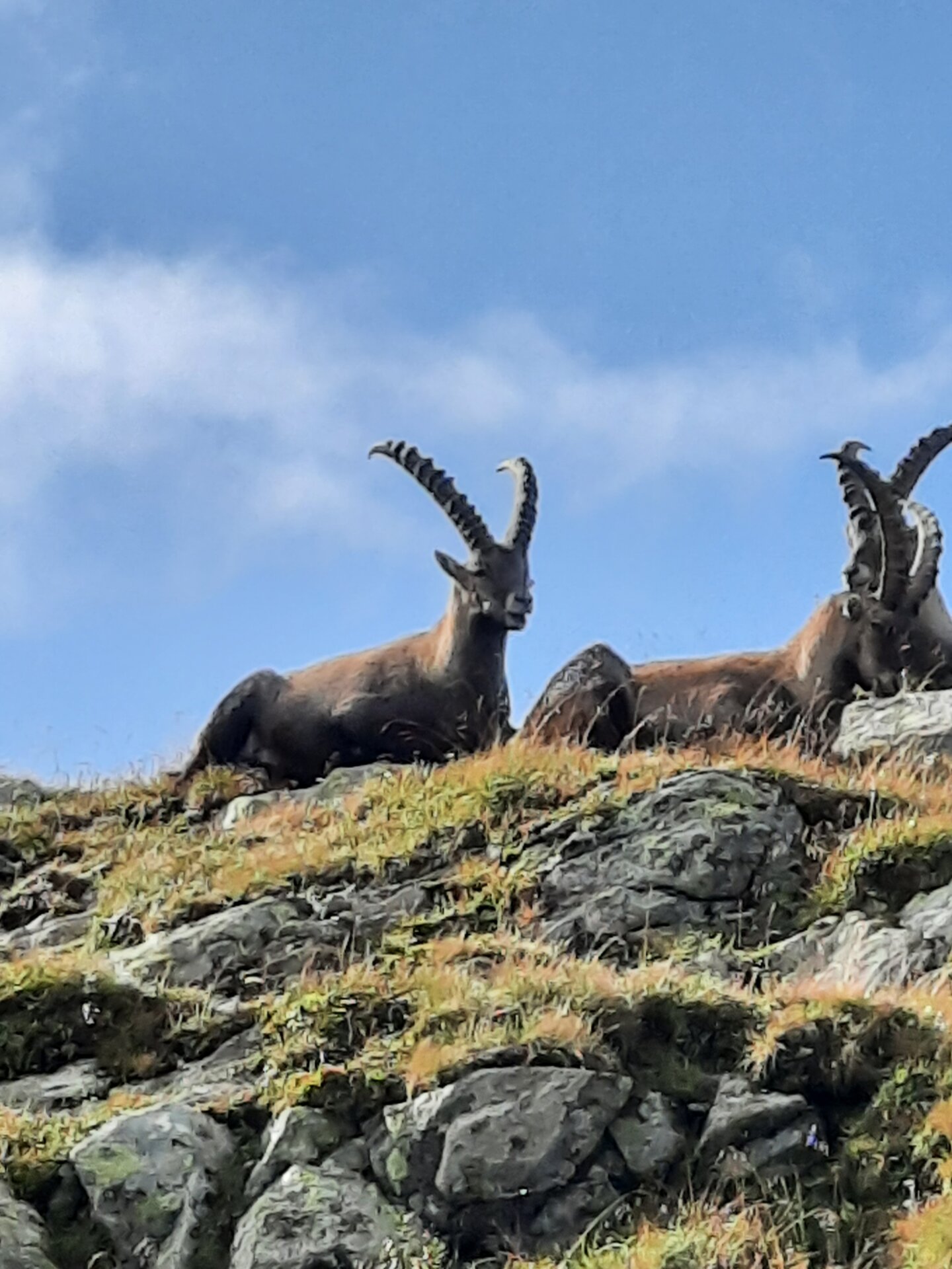 Wenn man die Steinböcke so anschaut, fühlt man fast schon ihre amüsierten Blicke über das Gestackse der Zweibeiner hier oben. Oder über die versuchte Vierbeiner-Variante mit Stöcken. Nun denn, die einen sind geboren, um an gähnenden Abgründen ihren Abendschmaus zu finden, die anderen, um in der Horizontalen ihr Dasein zu fristen. Jeder hat seine Berechtigung.