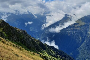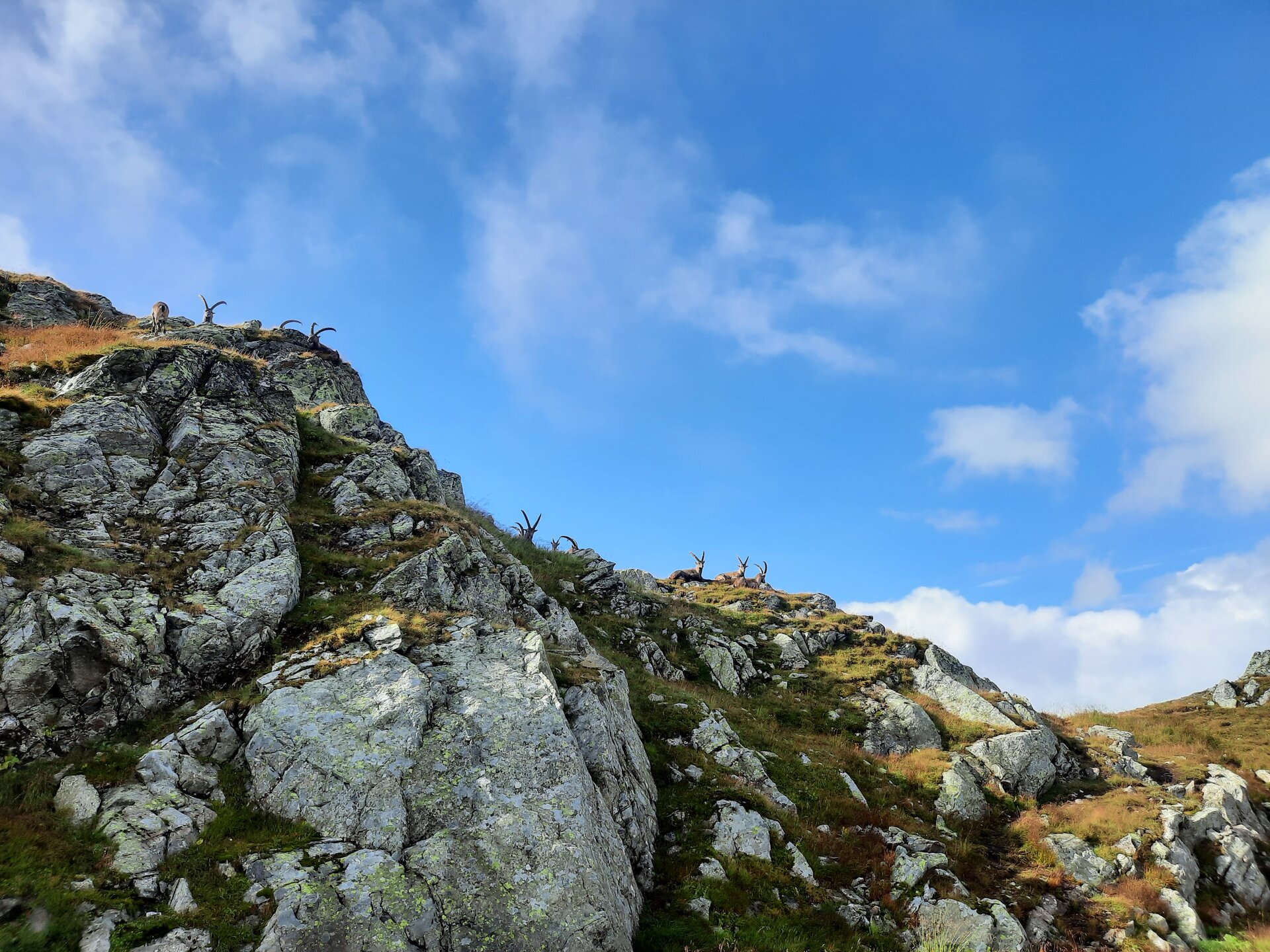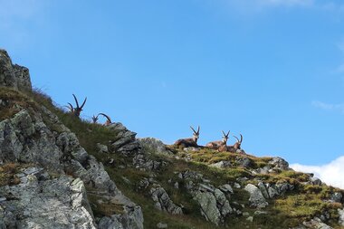 Der Blick nach links reißt mich aus meinen Träumen, und doch traue ich meinen Augen nicht: Eine ganze Herde an Steinböcken schaut zu uns hinab. Vorsichtig gehen wir auf unserem Weg weiter und kommen ihnen so noch näher. Von meinem Wanderführer erfahre ich, dass die Herde sich hier in einem relativ kleinen Umkreis bewegt. So verbrauchen die Wiederkäuer nicht allzu viel Energie und können gut überwintern. Futter finden sie dennoch auf Lawinenhängen, an denen das Gras zum Vorschein kommt.