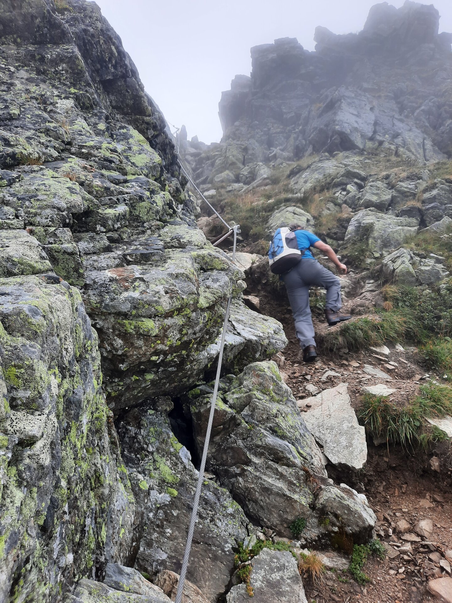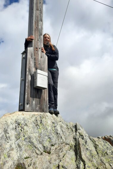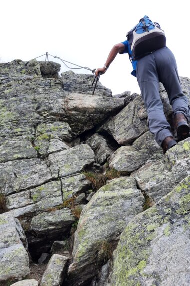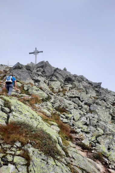 Alfred erklärt, dass gelb-weiße Markierungen auf einfache, meist talnahe Wege hinweisen, rote-weiße Markierungen auf schmälere, steilere Passagen und überwiegend unbefestigte Wege. Die blaue Farbe steht – anders als beim Skifahren – für Wege mit steilen, teilweise ausgesetzten Stellen, evtl. auch mit Kletterpassagen. Auf die Zamangspitze kann man auf rotem sowie blauem Weg gelangen, wir wählen die blaue Variante. Und die macht richtig Spaß! Auch wenn die leichte Kletterei viel zu kurz ist, spannend ist sie allemal. Hier mal Hand an den Fels legen, dort mal eine kurze Seilversicherung – es gibt auch einen ganz kleinen Kamin ;). Klar, wer mehr Kletter-Adrenalin braucht, der kann den Piz Buin begehen, der sich heute partout nicht zum Angucken entblößen will. Die Vallüla hingegen zeigt sich in ihrer vollen pyramidenförmigen Pracht. Und dann erneut Vierbeiner: Unter uns auf den Hängen sehen wir eine ganze Herde Gämse!