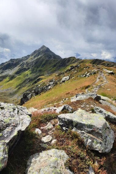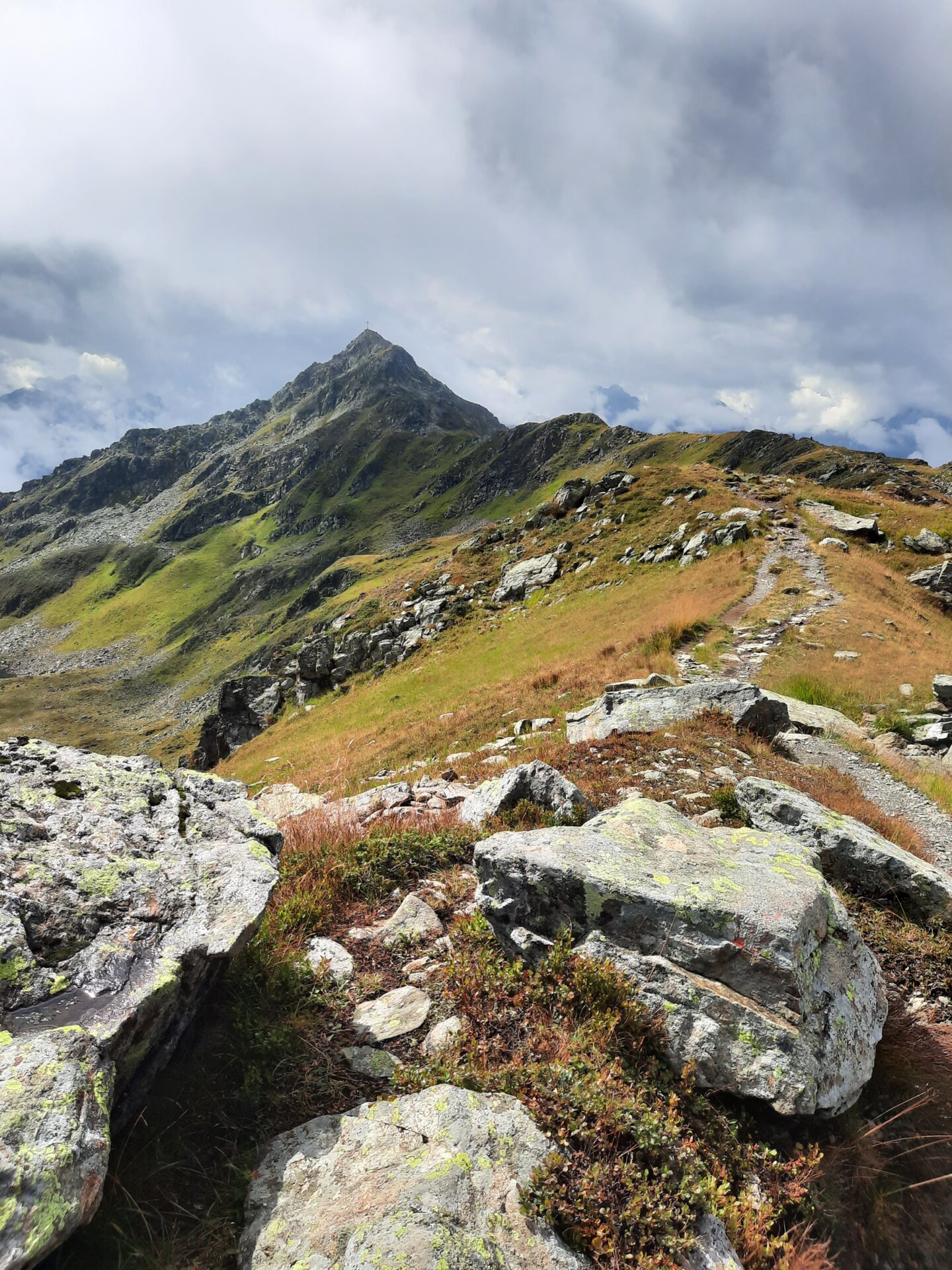 Von der Wormser Hütte könnte man auch absteigen zum Kapell, wo vor allem Kinderherzen am Abenteuerspielplatz Hochjoch laut schlagen werden. Wir aber gehen in leichter Steigung weiter hinauf, auf einem schmalen Pfad zum Kreuzjoch, das wir in rund 15 Minuten erreichen. Weiter geht es auf schmalen Wegen und im mystischen Licht zwischen Erika-Polstern auf den Grat Richtung Zamangspitze. Wir kommen an eine Stelle mit zwei Wegmöglichkeiten.