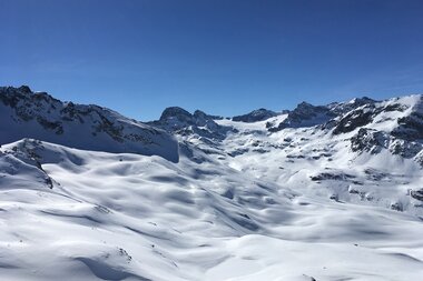 Nach einer gemütlichen Jause richten wir uns für die Abfahrt. Je nach Schneeverhältnissen lässt sich die Exposition hier perfekt variieren. Bei Neuschnee kann man eher in nördlicher Ausrichtung abfahren und bei Firn ist der Hennekopf mit seinen sonnigen Westhängen auch noch ein Geheimtipp. Am Talboden angekommen, muss man eventuell noch mal etwas schieben, um sich dann mit dem Schlepplift wieder zurück auf Seeniveau ziehen zu lassen.