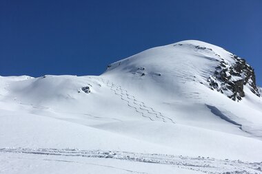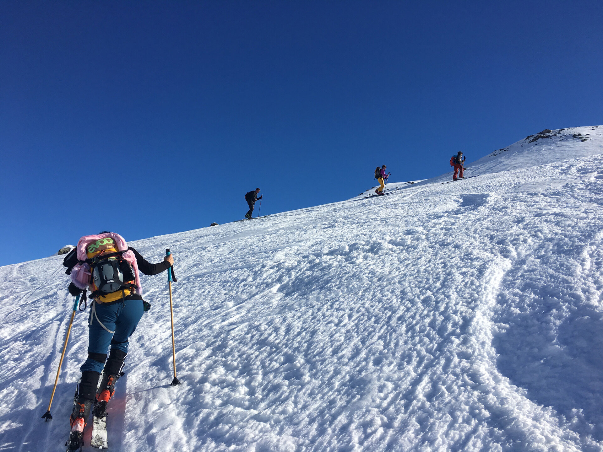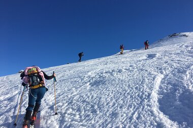 Auf etwa 2.000 m befindet sich der schattige Fellanlegeplatz. Von hier aus geht es über eine kurze Steilstufe in Richtung einer Wasserhaltung am Bieltalbach. Die Standardroute verläuft nach der Querung des Bachbettes zunächst etwas steiler und dann über einen breiten, sich zurücklegenden Westhang. Die Hälfte der Tour hat man oberhalb des Runden Kopfes (2.376 m) hinter sich. Das Schöne an der Route sind die immer wieder variierenden Bergperspektiven mit dem langgestreckten Bieltal, den Hochebenen im Vordergrund und den dahinter aufgehenden, vergletscherten Hängen der umgebenden rauhen Gipfelspitzen. Es folgt ein flacheres Gelände mit Mulden und Tälchen, wo man sich eher links hält. Ab hier kann man auch einen ersten Blick auf den erhabenen Piz Buin am Ende des Ochsentaler Gletschers erhaschen. Der Gipfelsturm fordert nochmal alle Kräfte. Für den etwas steileren Schlusshang können besonders im Frühjahr auch Harscheisen hilfreich sein.