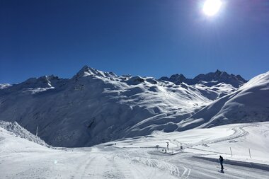 Der krönende Abschluss ist natürlich eine süße oder herzhafte Belohnung auf der Sonnenterrasse des Gasthaus Piz Buin oder im Silvretta-Haus. Bei einem kühlen Aprés-Getränk lassen wir den Blick über den Stausee schweifen und wer gute Augen hat, kann von hier sogar die eigenen Abfahrtsspuren am Hennekopf erspähen.