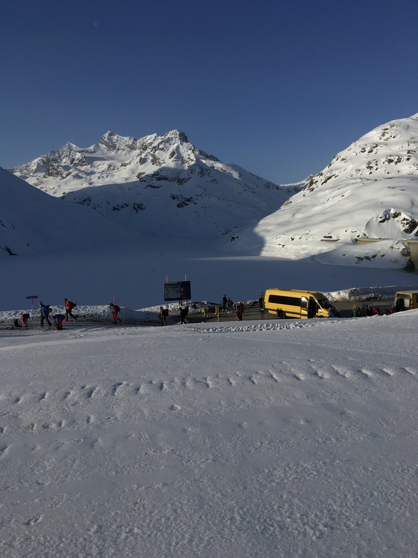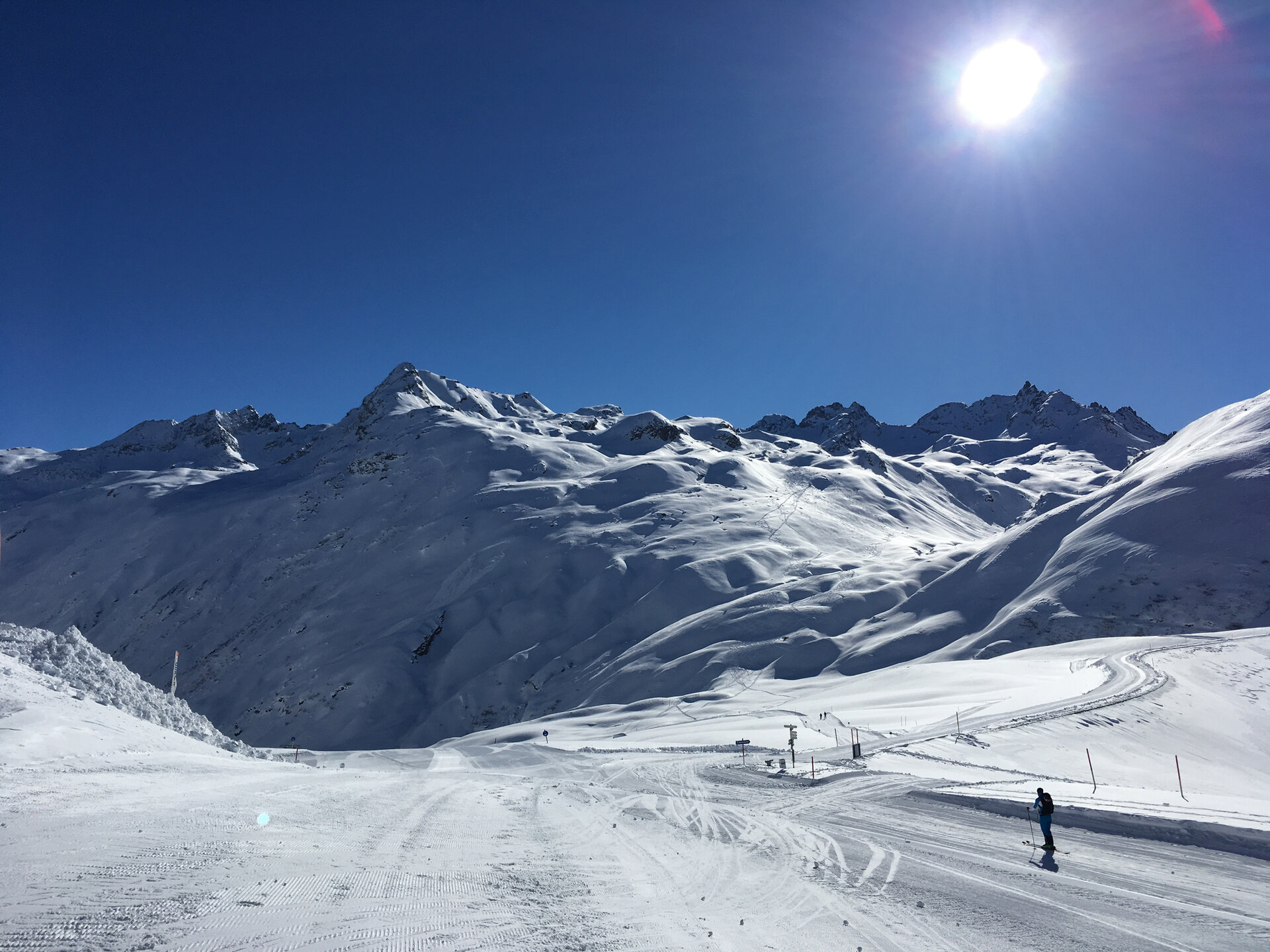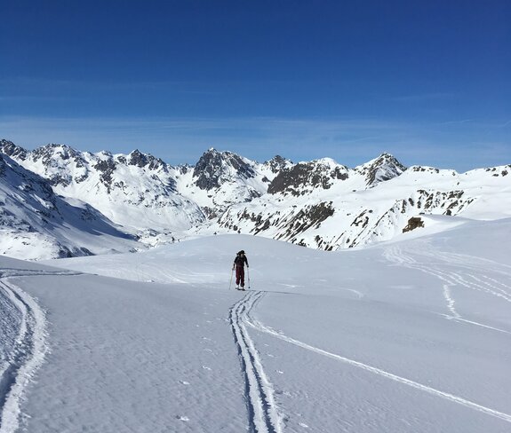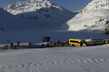 Die Anreise zum Ausgangspunkt der Skitour nimmt schon ein wenig Zeit in Anspruch. Dafür ist diese bereits ein unvergessliches Erlebnis. Von Partenen aus, im Talschluss des hinteren Montafon gelegen, geht es für uns zuerst mit der Vermuntbahn hinauf zur Bergstation Tromenier. Noch bevor wir uns vom eindrücklichen Ausblick zurück ins Montafon satt sehen können, geht es schon weiter mit dem sogenannten Tunneltaxi durch zwei Bergstollen und dann über die Silvretta-Hochalpenstraße, die im Winter für den allgemeinen Verkehr gesperrt ist. Wenn sich nach dem düsteren Tunnel der Blick auf die glitzernde Bergwelt eröffnet, fühlt man sich auch gleich in eine andere Welt versetzt. Schnell fällt der alltägliche Stress von einem ab und das umgebende Bergpanorama lädt zum Träumen ein.